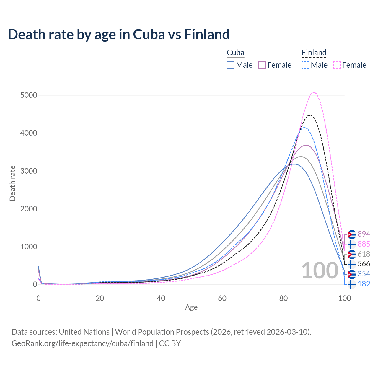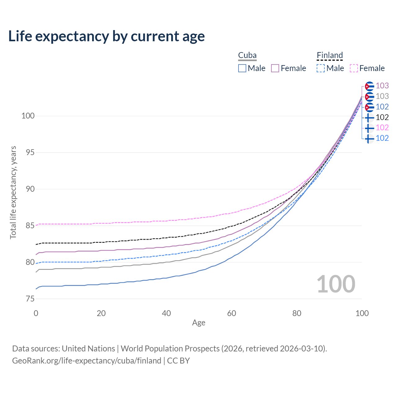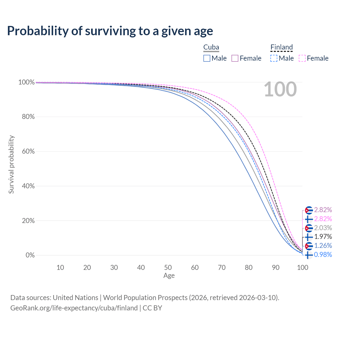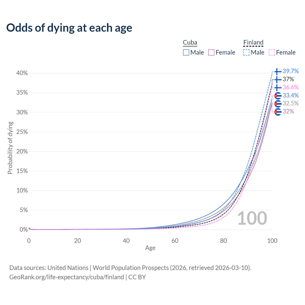 This life expectancy calculator shows the odds of living to 100, 95, 90, and below based on current age for both males and females in Cuba and Finland, along with mean and median age of death. The calculations are based on the 2026 life tables (actuarial tables) from the UN World Population Prospects.