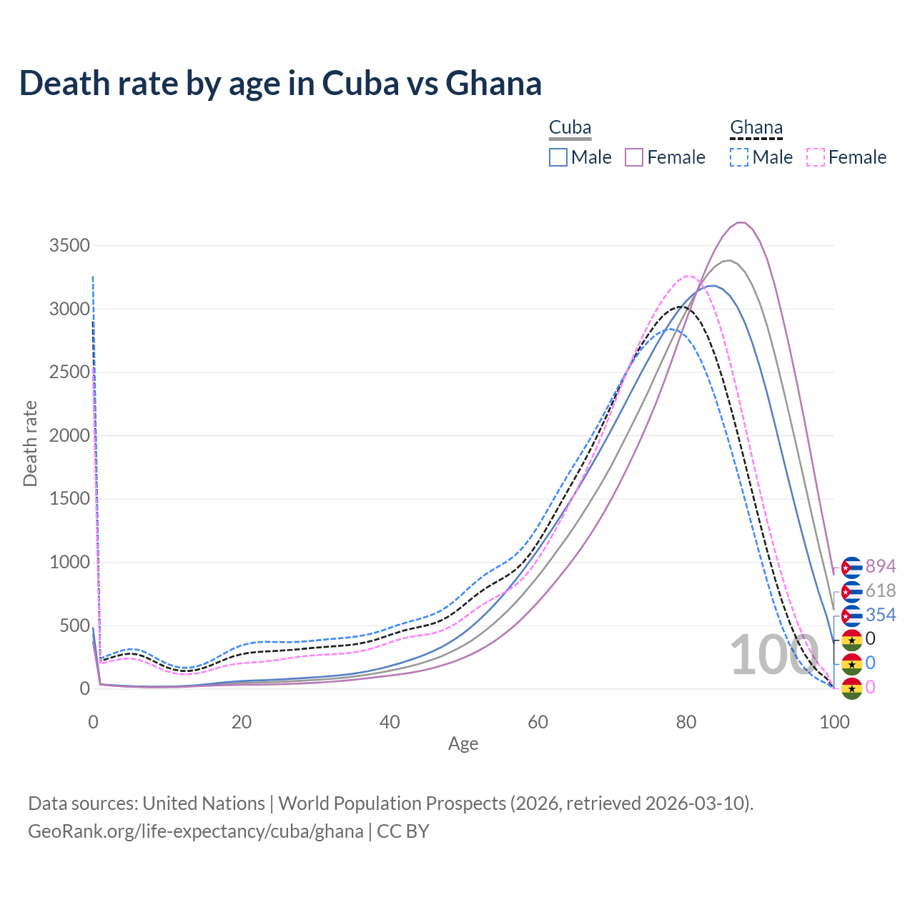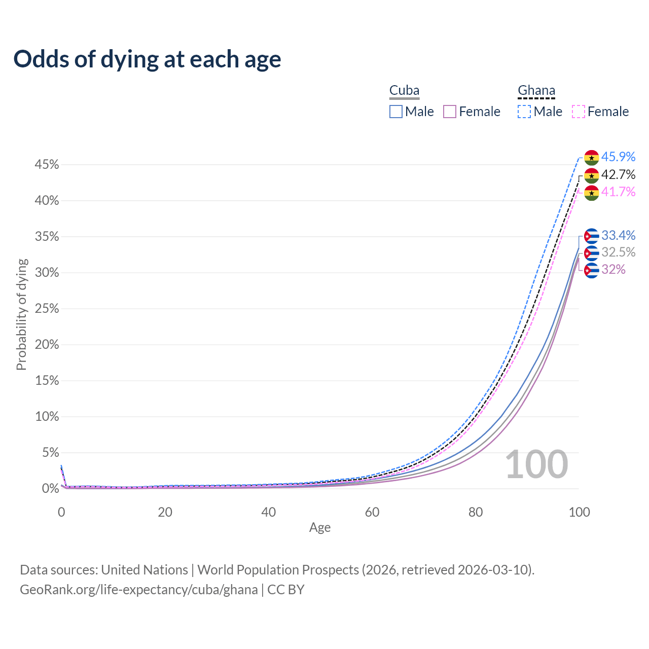 This life expectancy calculator shows the odds of living to 100, 95, 90, and below based on current age for both males and females in Cuba and Ghana, along with mean and median age of death. The calculations are based on the 2026 life tables (actuarial tables) from the UN World Population Prospects.