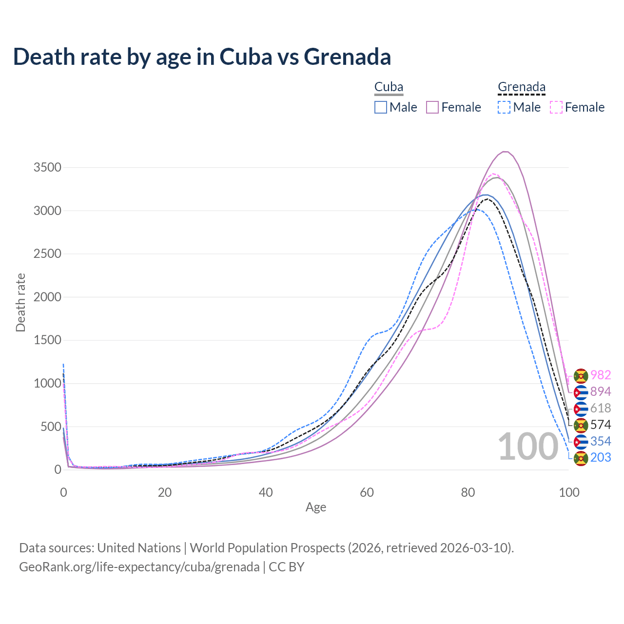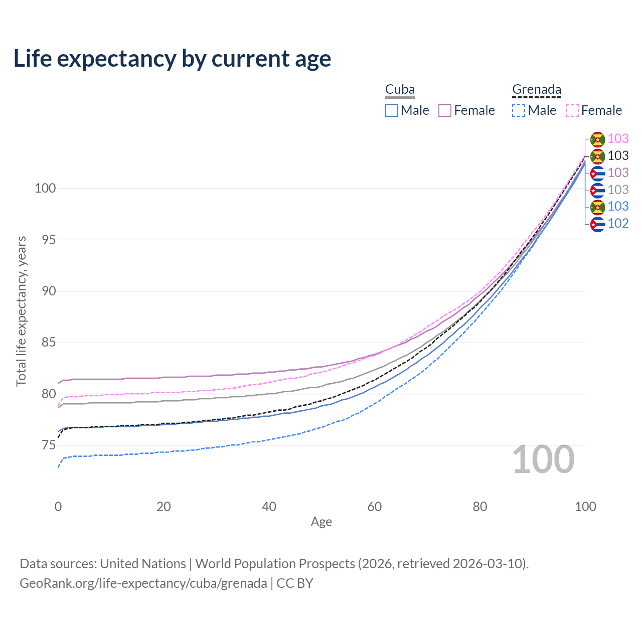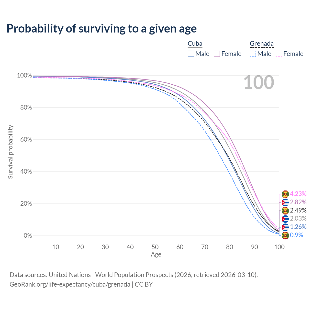 This life expectancy calculator shows the odds of living to 100, 95, 90, and below based on current age for both males and females in Cuba and Grenada, along with mean and median age of death. The calculations are based on the 2026 life tables (actuarial tables) from the UN World Population Prospects.
