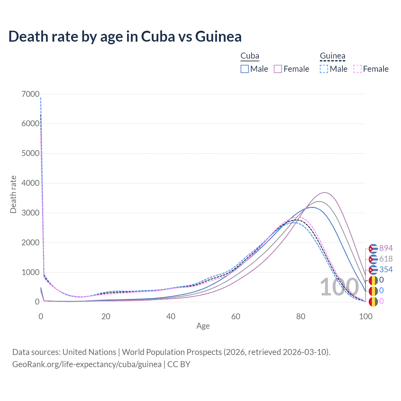In Cuba, the most common age of death is 86, compared to 0 in Guinea. The median age of death is 81.5 in Cuba and 70.6 in Guinea, meaning only half of each cohort is expected to live past that age.