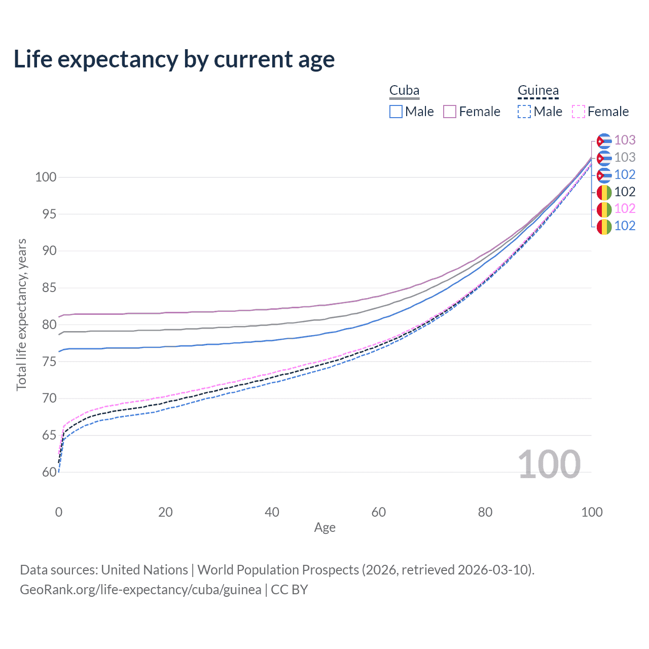 This life expectancy calculator shows the odds of living to 100, 95, 90, and below based on current age for both males and females in Cuba and Guinea, along with mean and median age of death. The calculations are based on the 2026 life tables (actuarial tables) from the UN World Population Prospects.