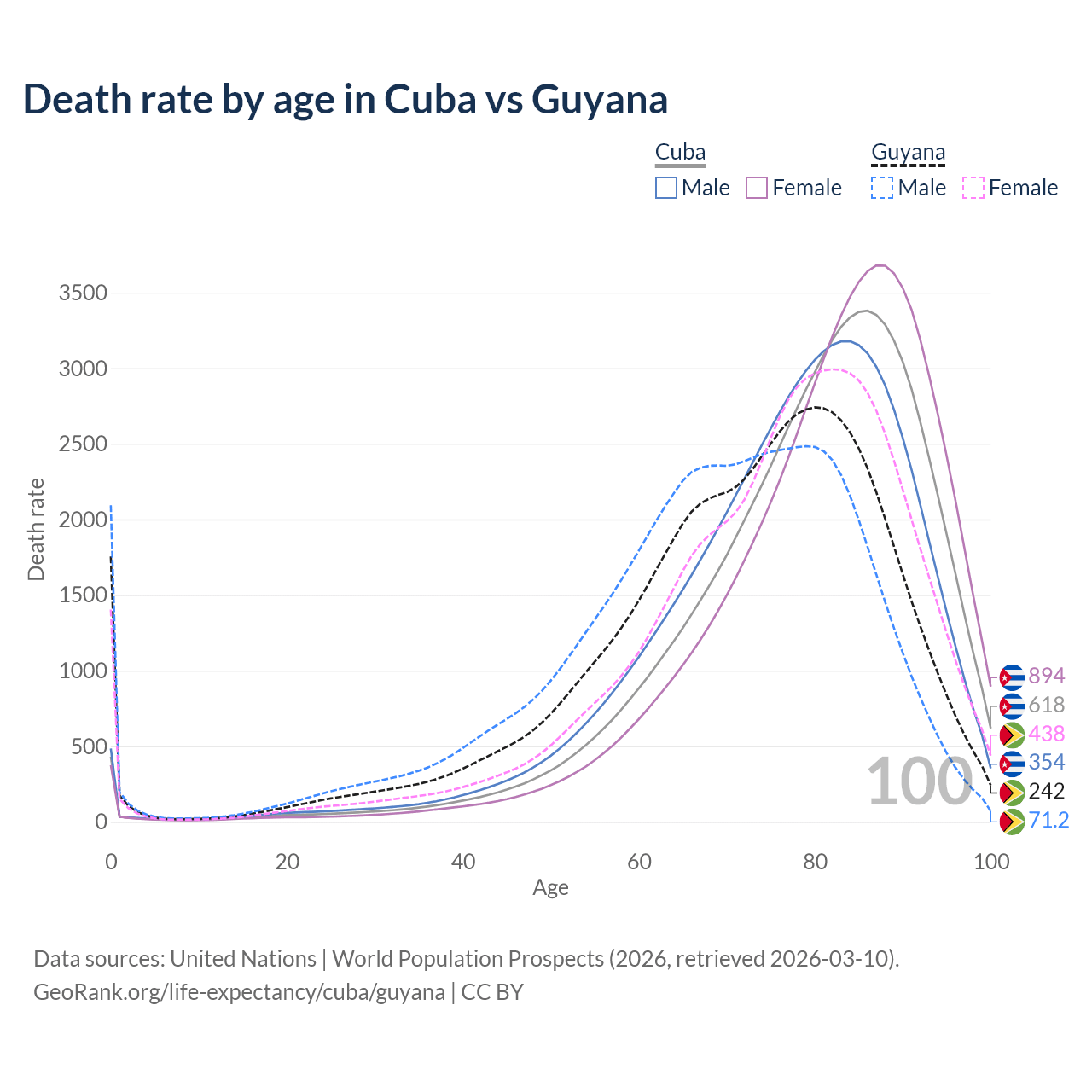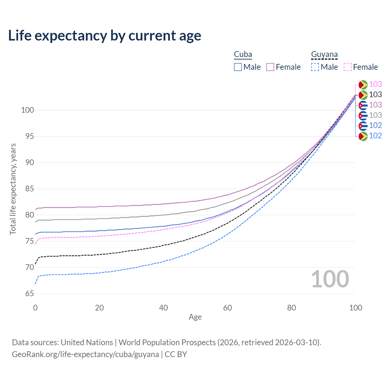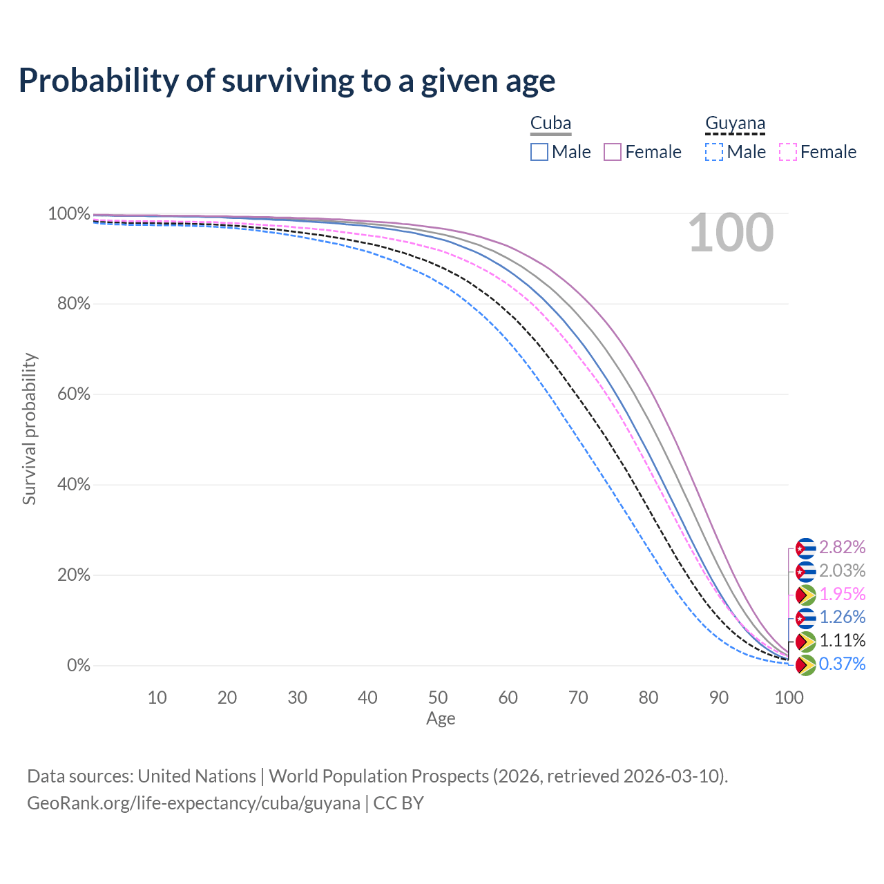 This life expectancy calculator shows the odds of living to 100, 95, 90, and below based on current age for both males and females in Cuba and Guyana, along with mean and median age of death. The calculations are based on the 2026 life tables (actuarial tables) from the UN World Population Prospects.