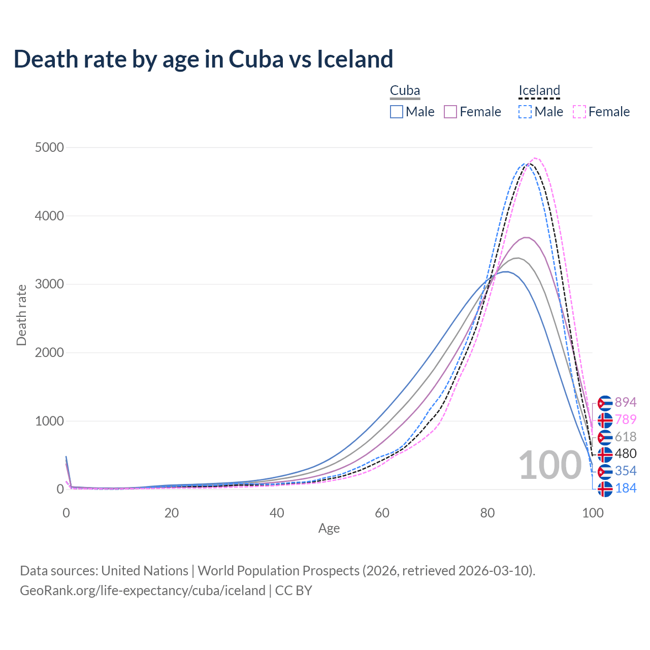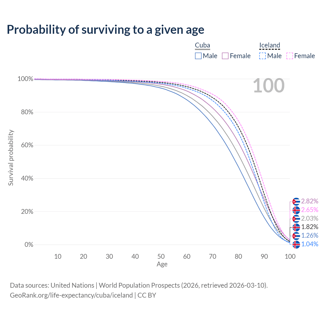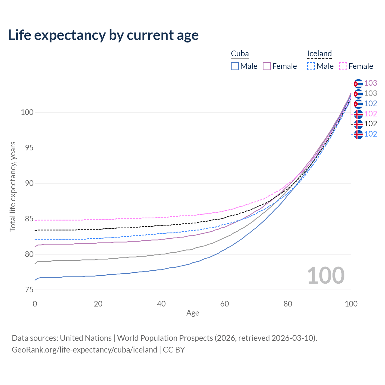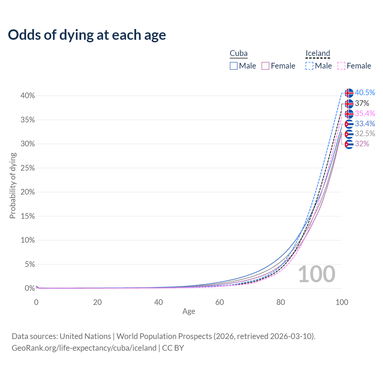 This life expectancy calculator shows the odds of living to 100, 95, 90, and below based on current age for both males and females in Cuba and Iceland, along with mean and median age of death. The calculations are based on the 2026 life tables (actuarial tables) from the UN World Population Prospects.