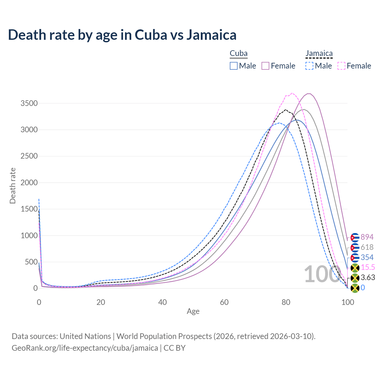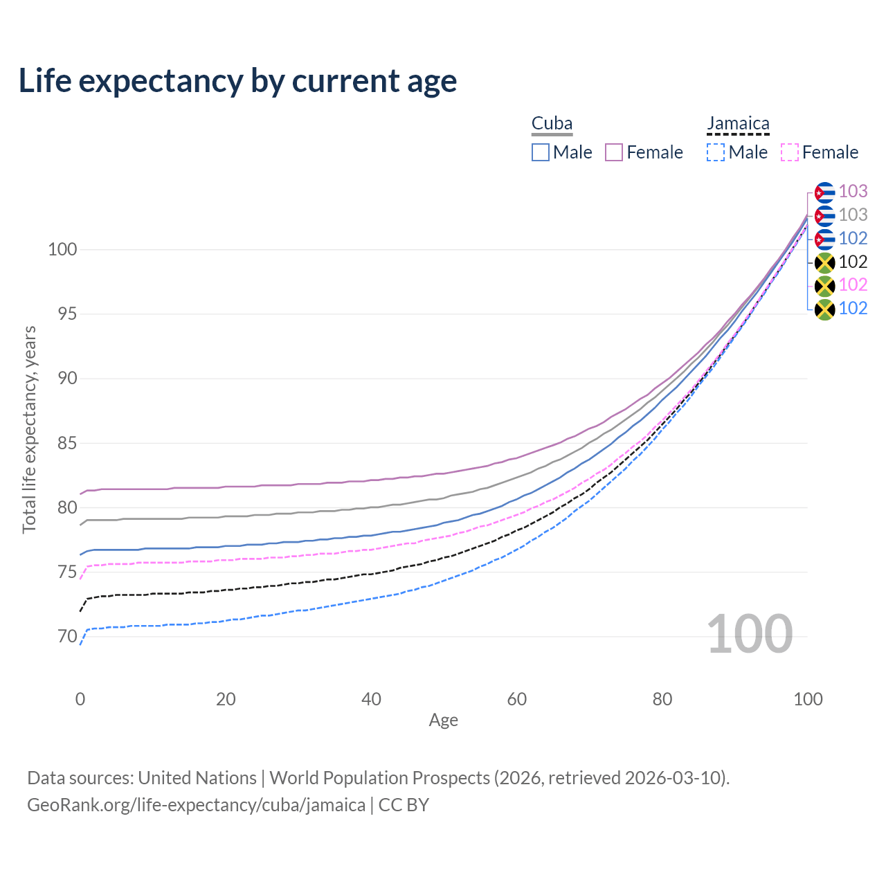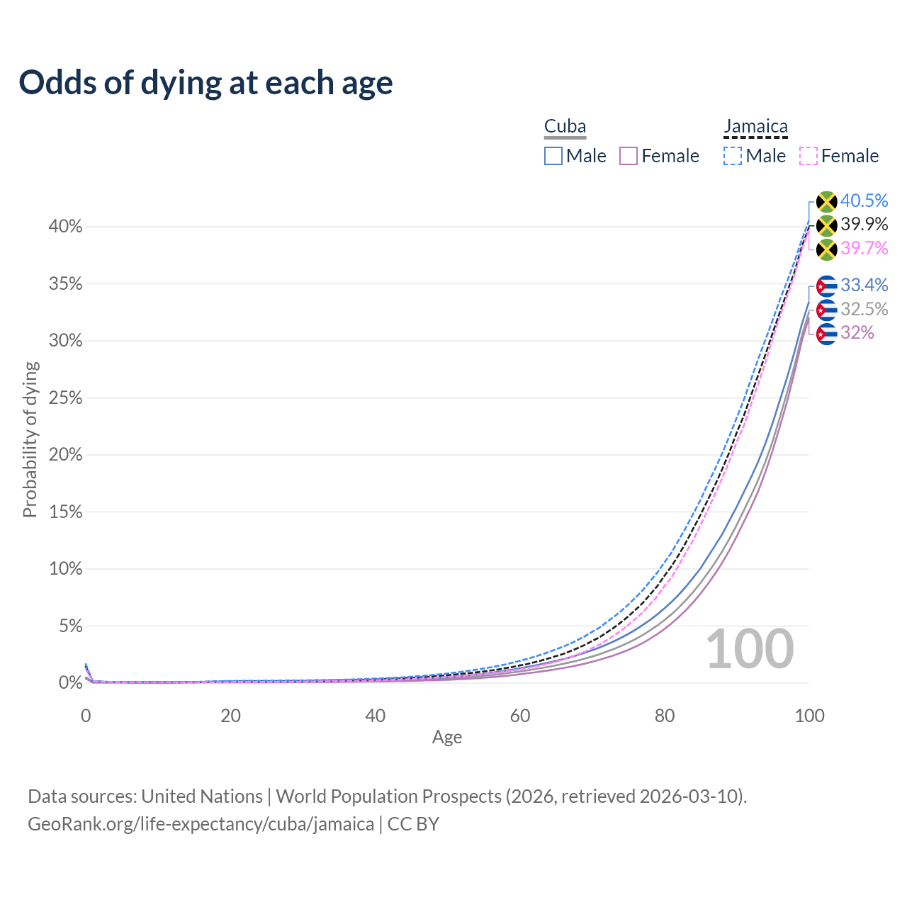 This life expectancy calculator shows the odds of living to 100, 95, 90, and below based on current age for both males and females in Cuba and Jamaica, along with mean and median age of death. The calculations are based on the 2026 life tables (actuarial tables) from the UN World Population Prospects.