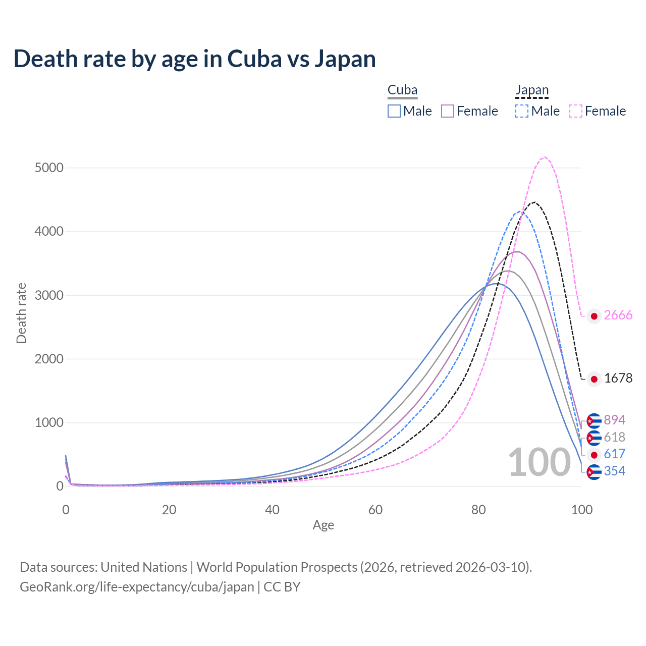 This life expectancy calculator shows the odds of living to 100, 95, 90, and below based on current age for both males and females in Cuba and Japan, along with mean and median age of death. The calculations are based on the 2026 life tables (actuarial tables) from the UN World Population Prospects.