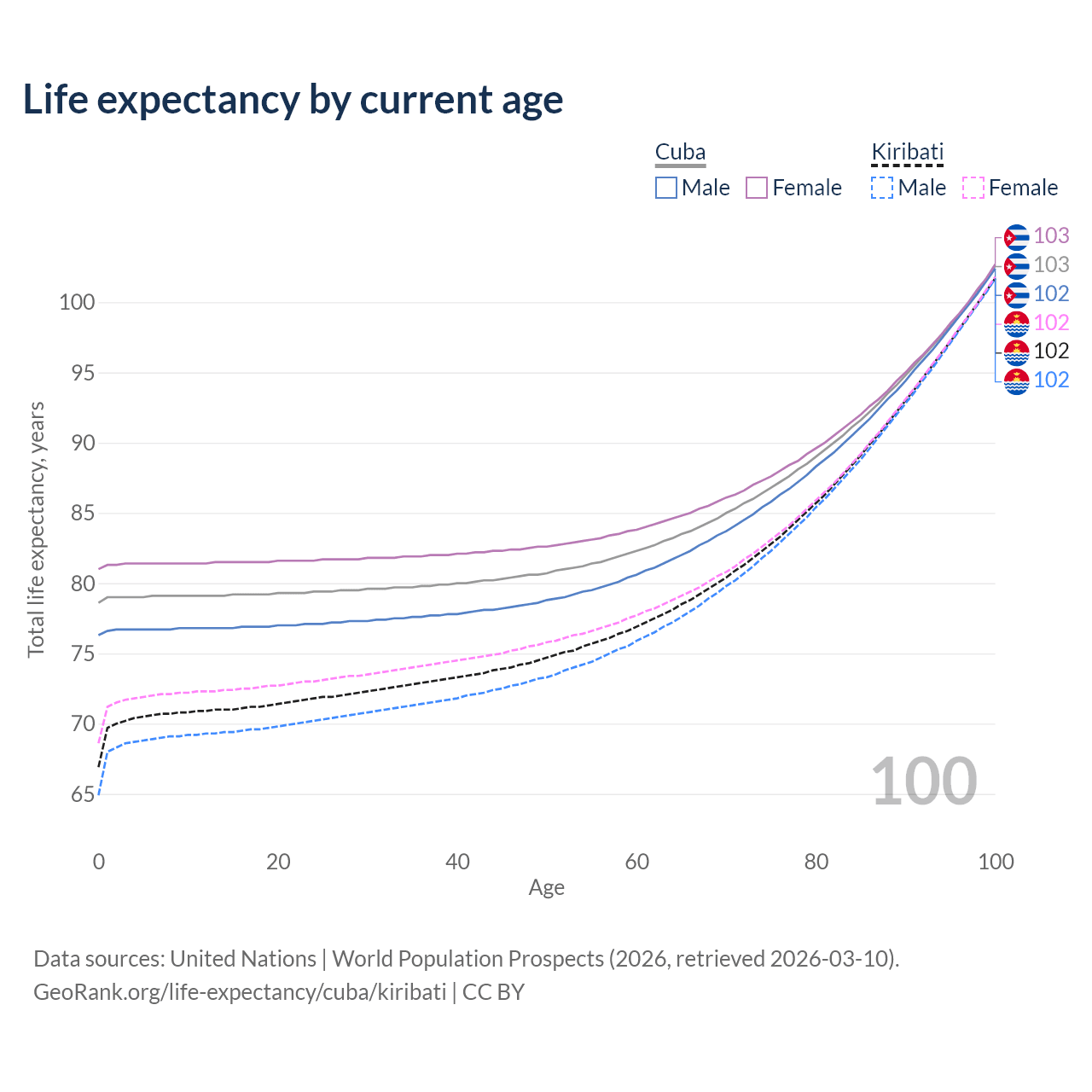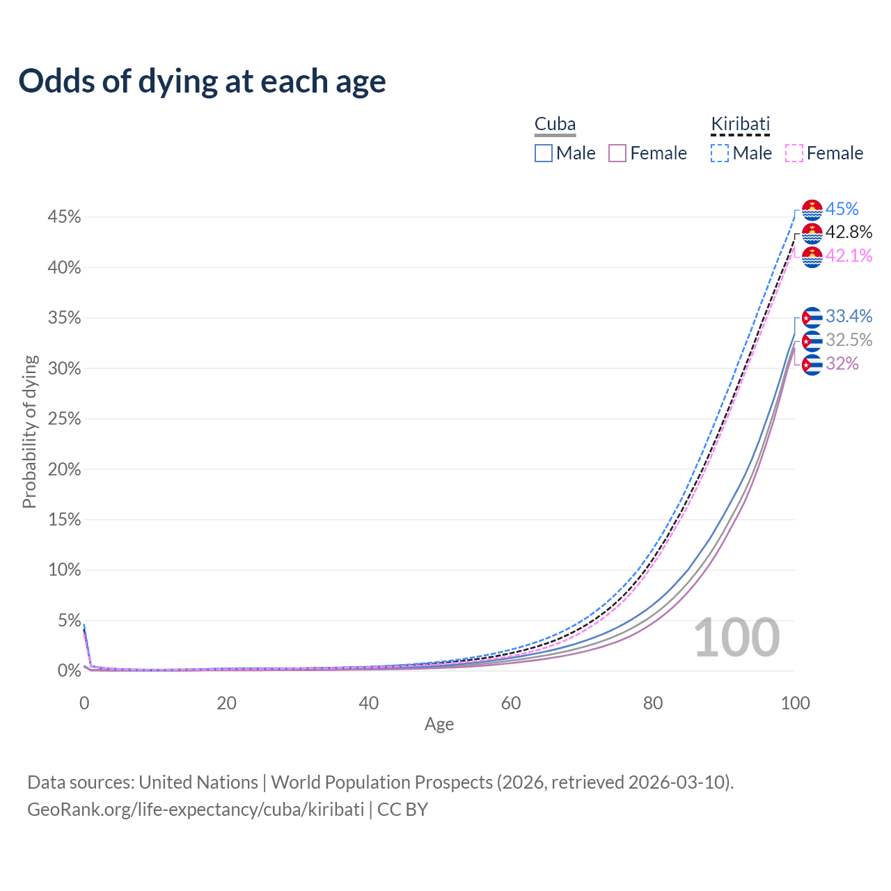 This life expectancy calculator shows the odds of living to 100, 95, 90, and below based on current age for both males and females in Cuba and Kiribati, along with mean and median age of death. The calculations are based on the 2026 life tables (actuarial tables) from the UN World Population Prospects.