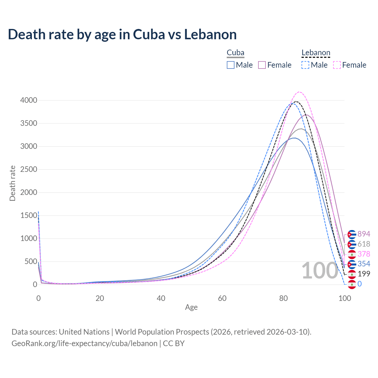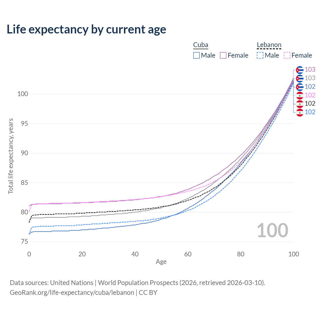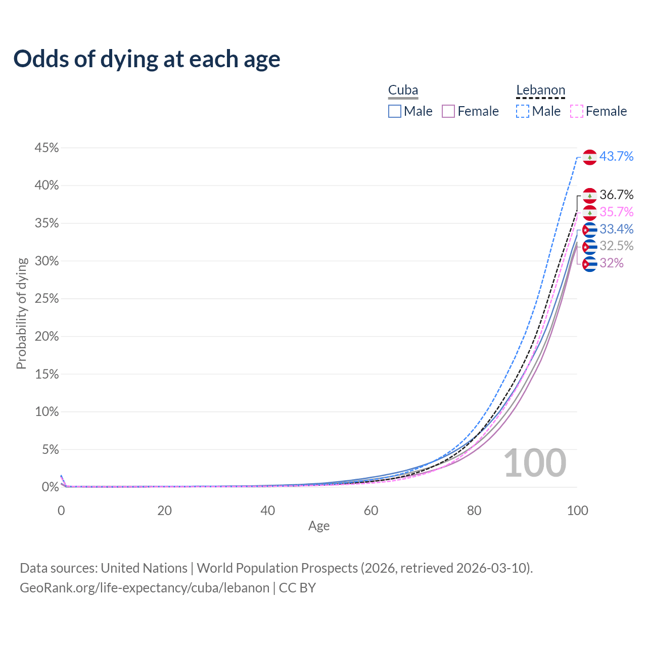 This life expectancy calculator shows the odds of living to 100, 95, 90, and below based on current age for both males and females in Cuba and Lebanon, along with mean and median age of death. The calculations are based on the 2026 life tables (actuarial tables) from the UN World Population Prospects.
