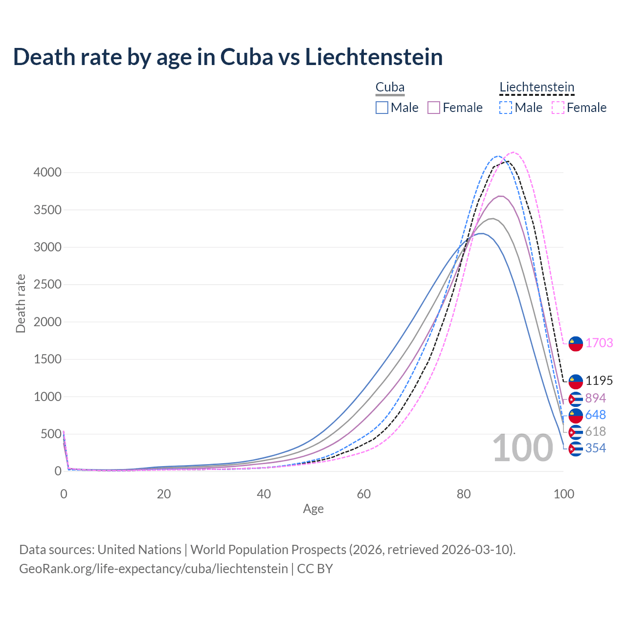 In Cuba, the most common age of death is 86, compared to 89 in Liechtenstein. The median age of death is 81.5 in Cuba and 86.3 in Liechtenstein, meaning only half of each cohort is expected to live past that age.