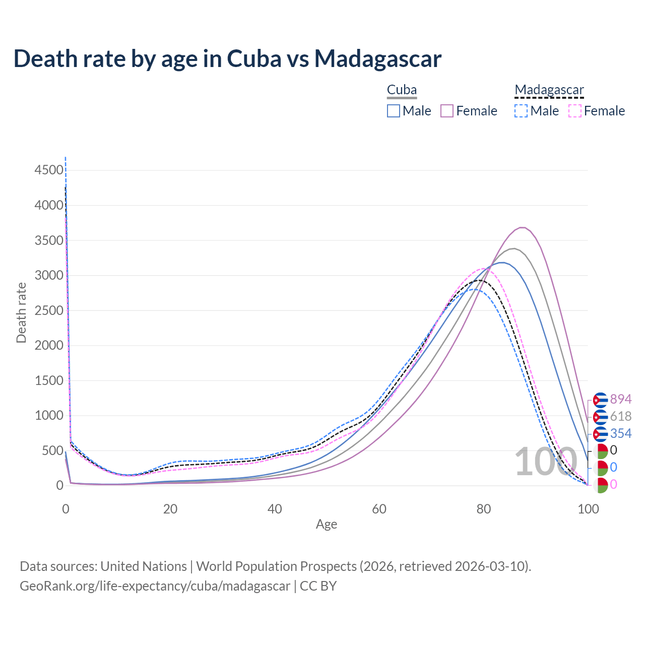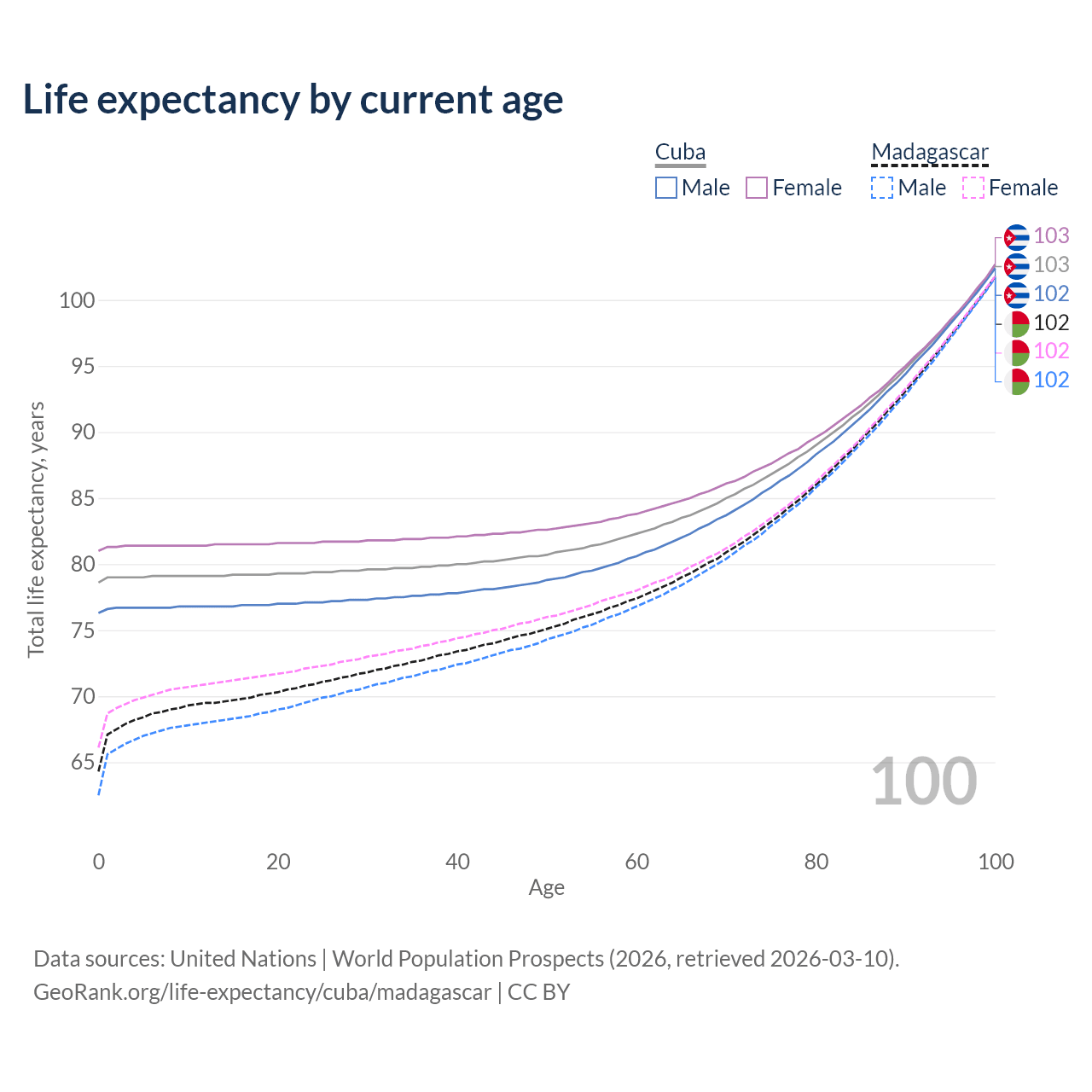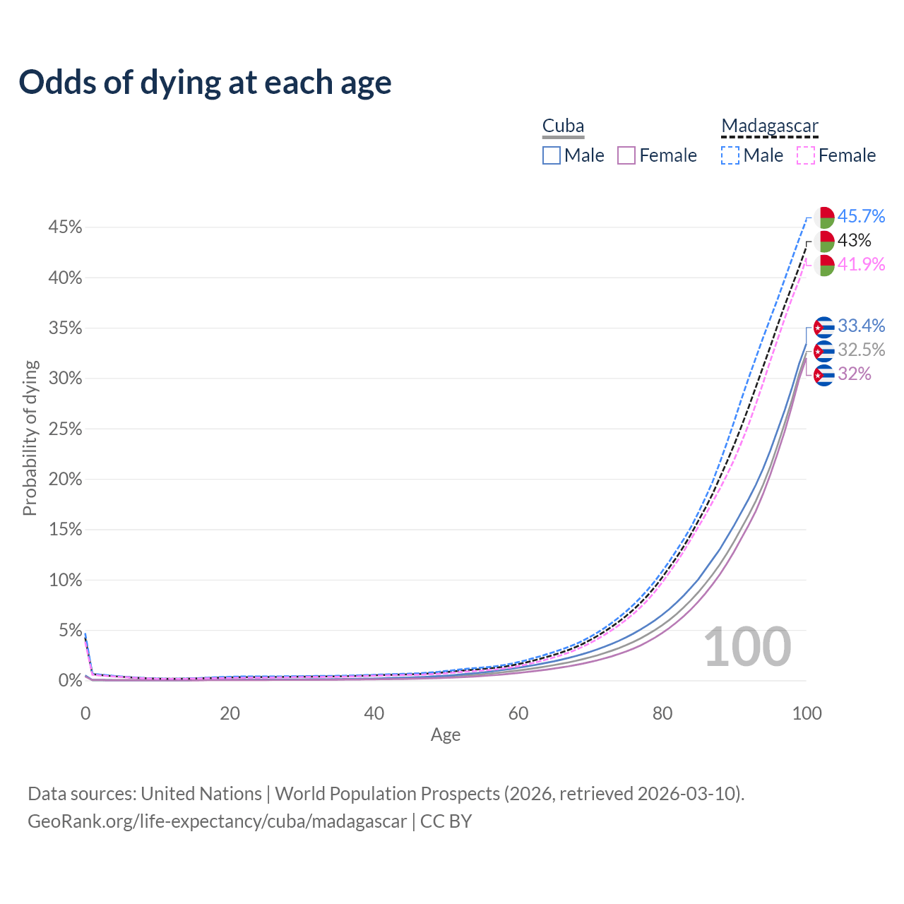 This life expectancy calculator shows the odds of living to 100, 95, 90, and below based on current age for both males and females in Cuba and Madagascar, along with mean and median age of death. The calculations are based on the 2026 life tables (actuarial tables) from the UN World Population Prospects.