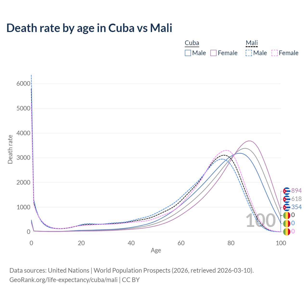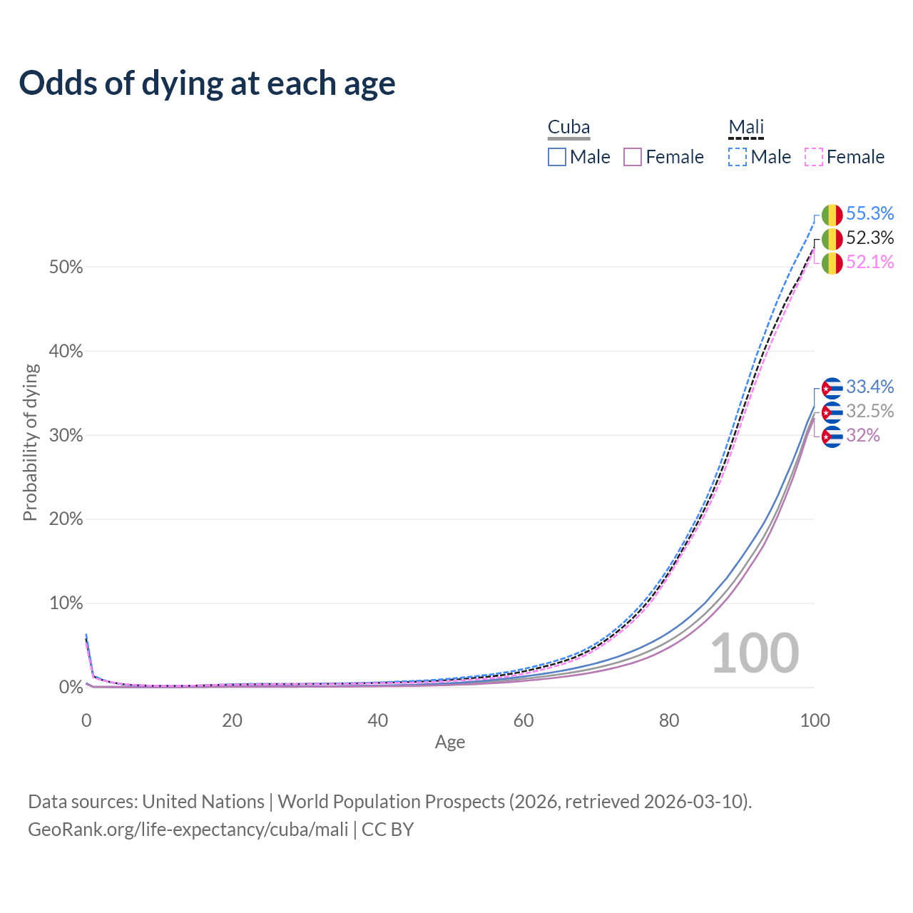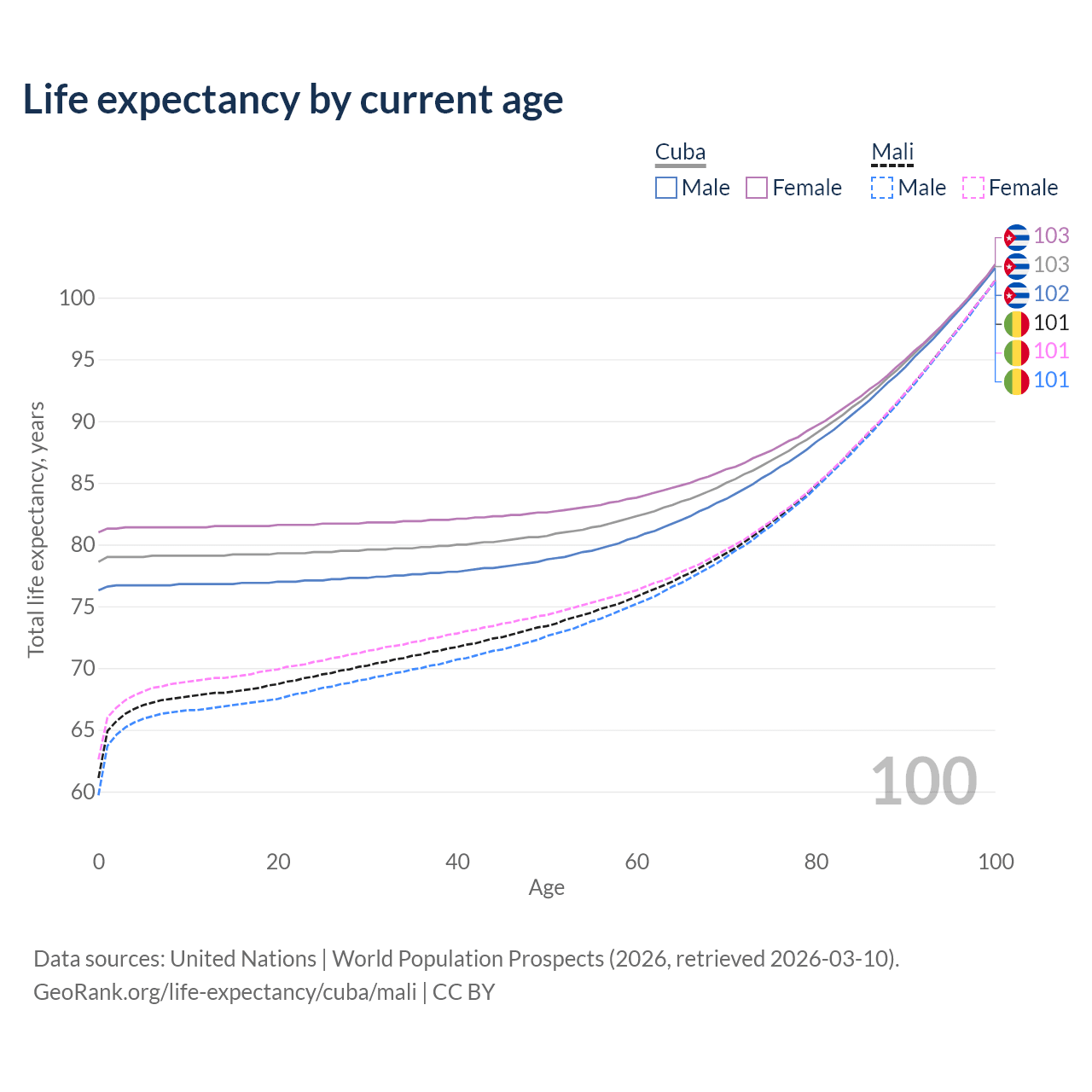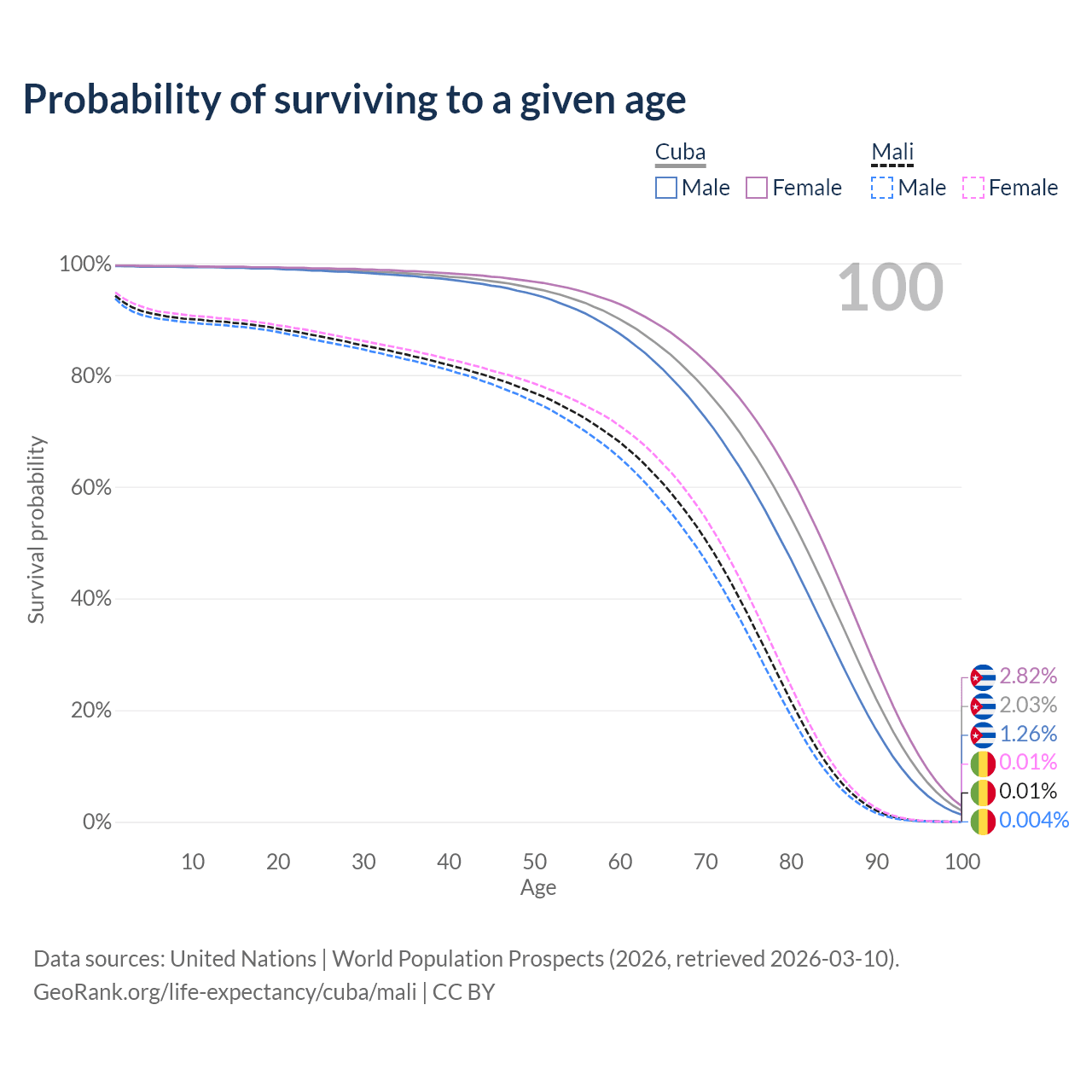 This life expectancy calculator shows the odds of living to 100, 95, 90, and below based on current age for both males and females in Cuba and Mali, along with mean and median age of death. The calculations are based on the 2026 life tables (actuarial tables) from the UN World Population Prospects.