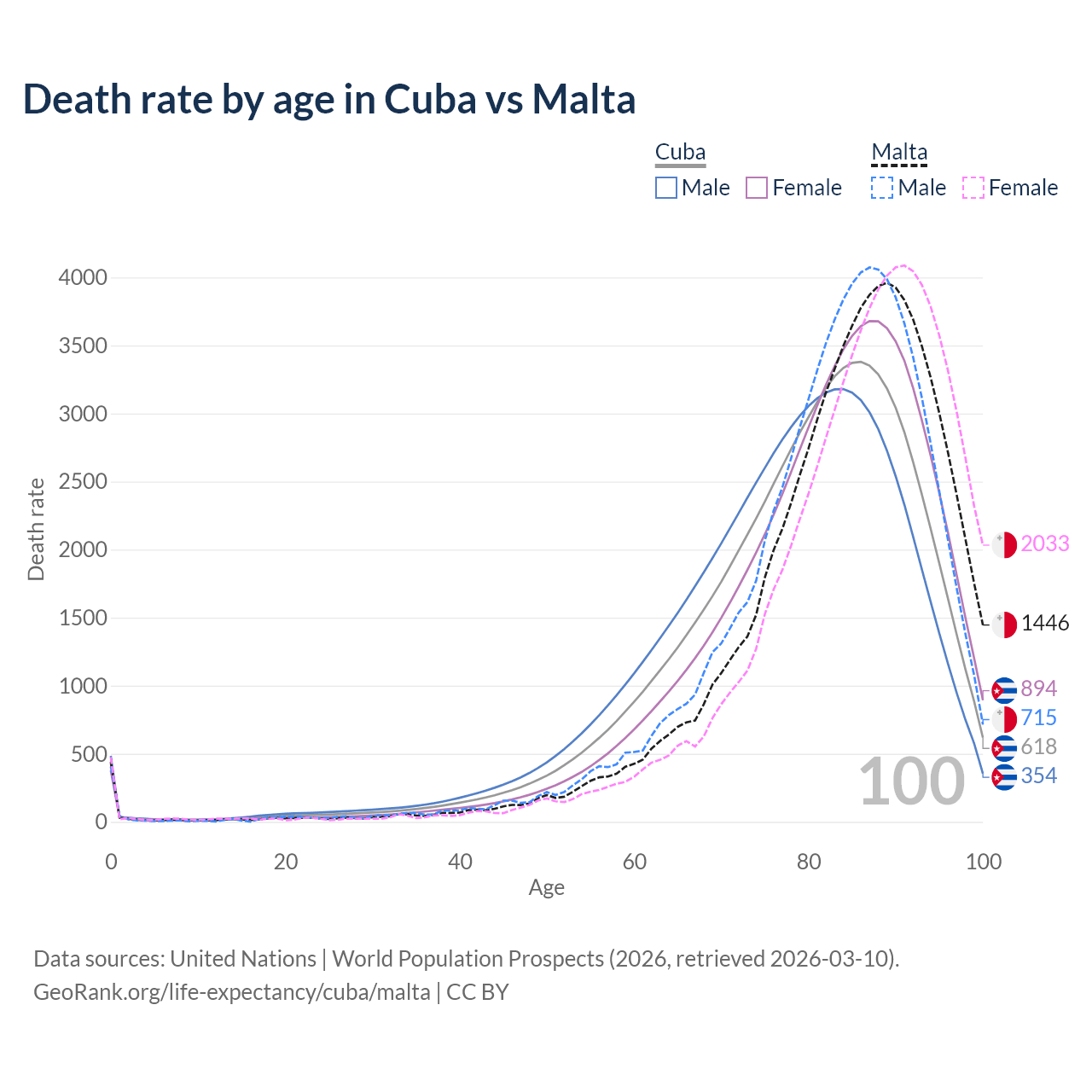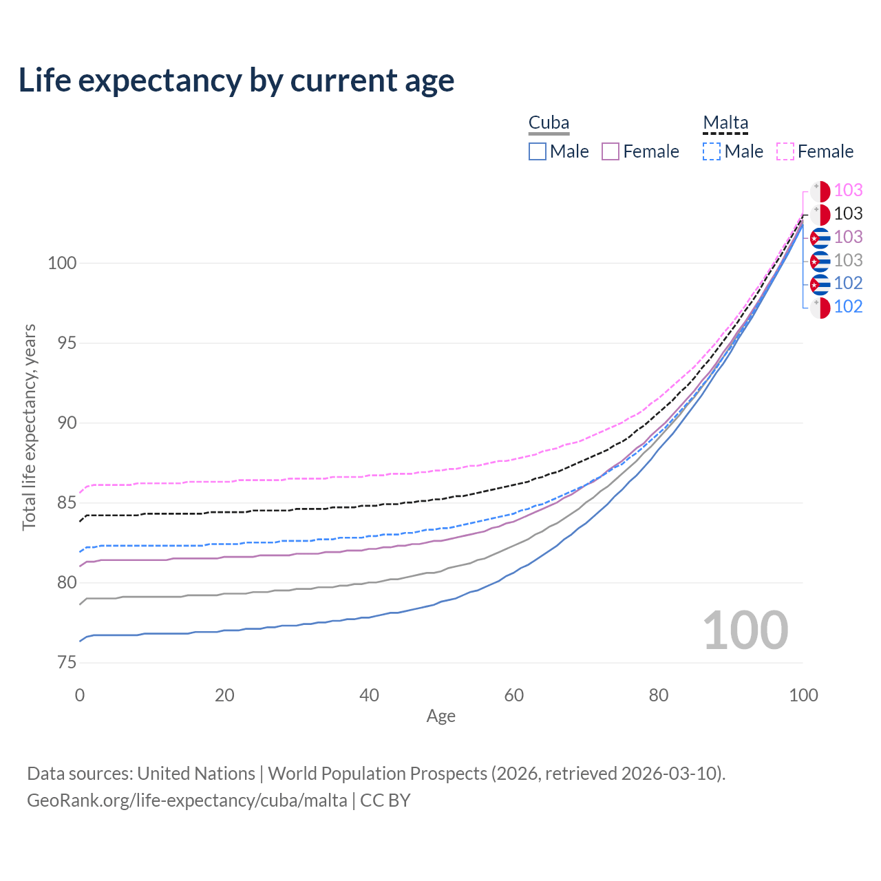 This life expectancy calculator shows the odds of living to 100, 95, 90, and below based on current age for both males and females in Cuba and Malta, along with mean and median age of death. The calculations are based on the 2026 life tables (actuarial tables) from the UN World Population Prospects.
