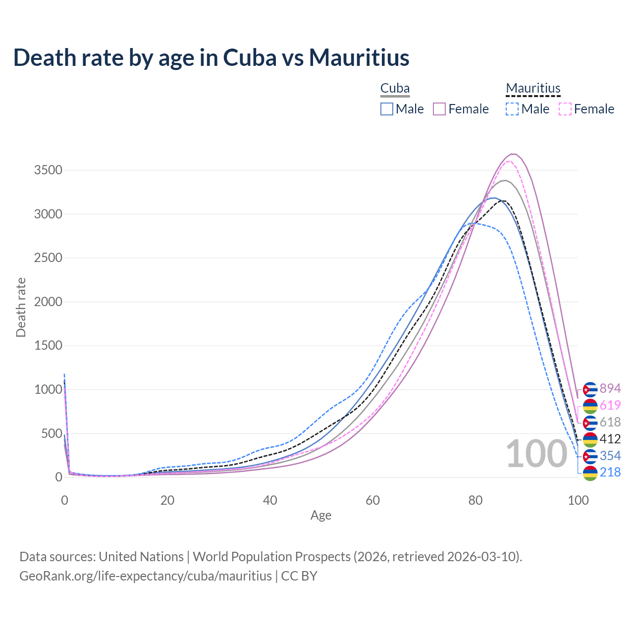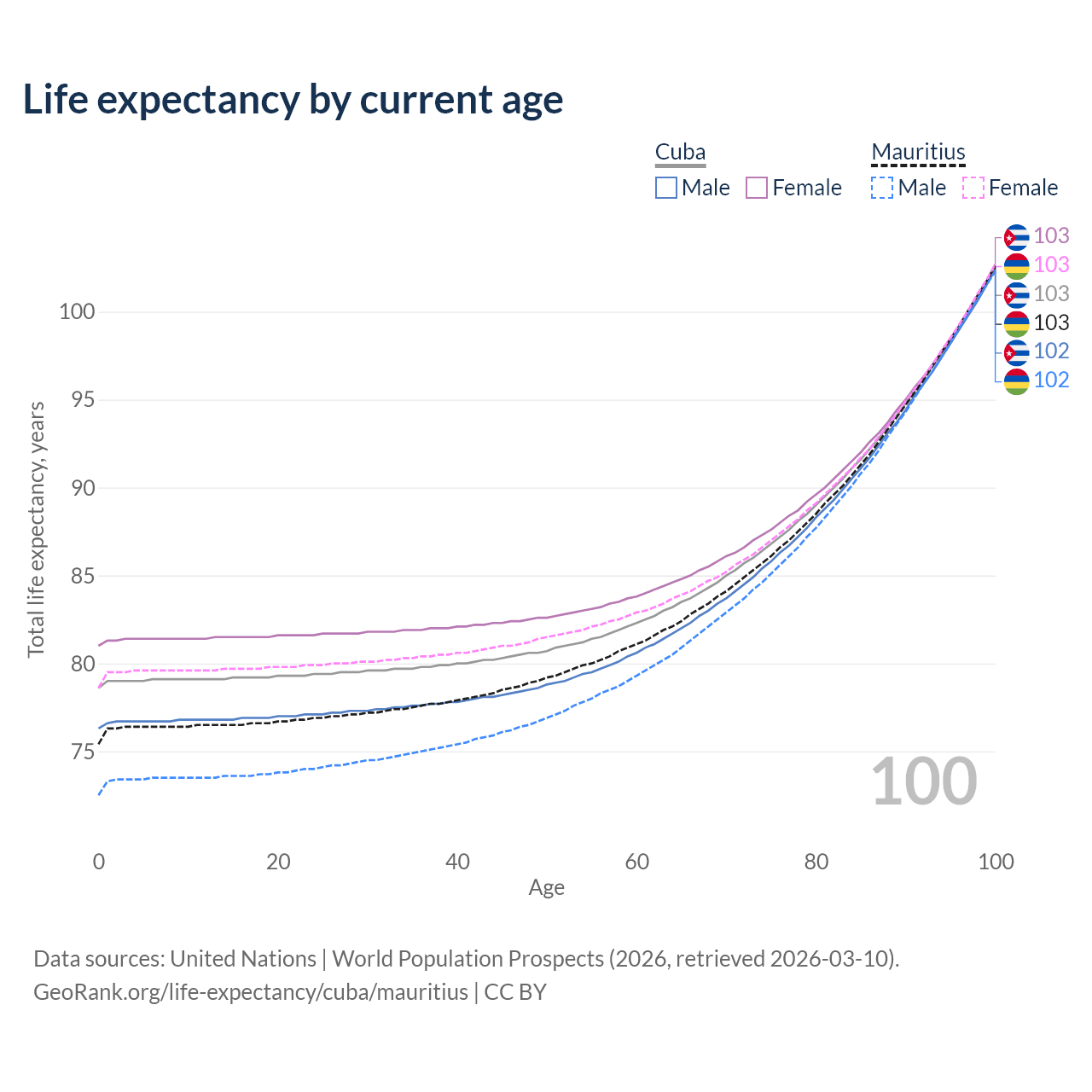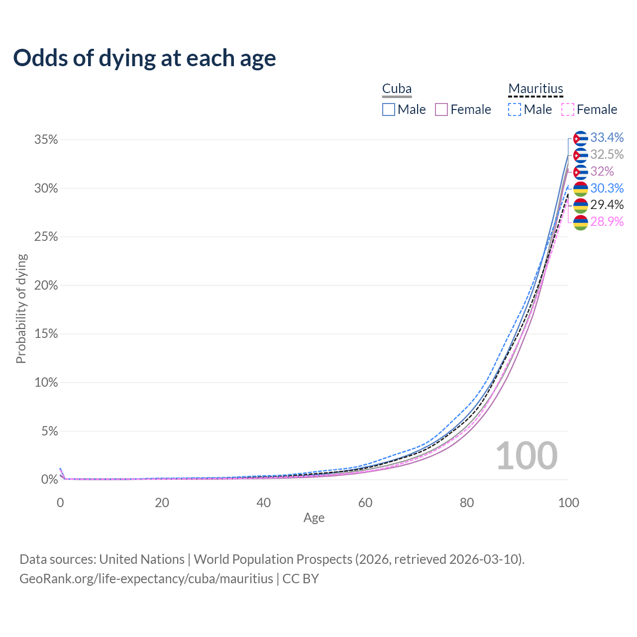 This life expectancy calculator shows the odds of living to 100, 95, 90, and below based on current age for both males and females in Cuba and Mauritius, along with mean and median age of death. The calculations are based on the 2026 life tables (actuarial tables) from the UN World Population Prospects.