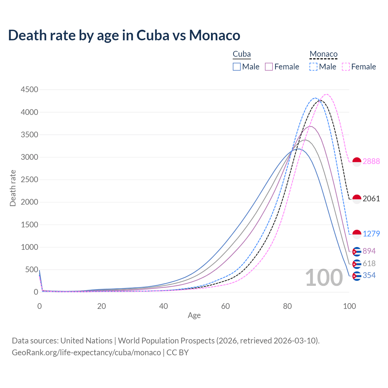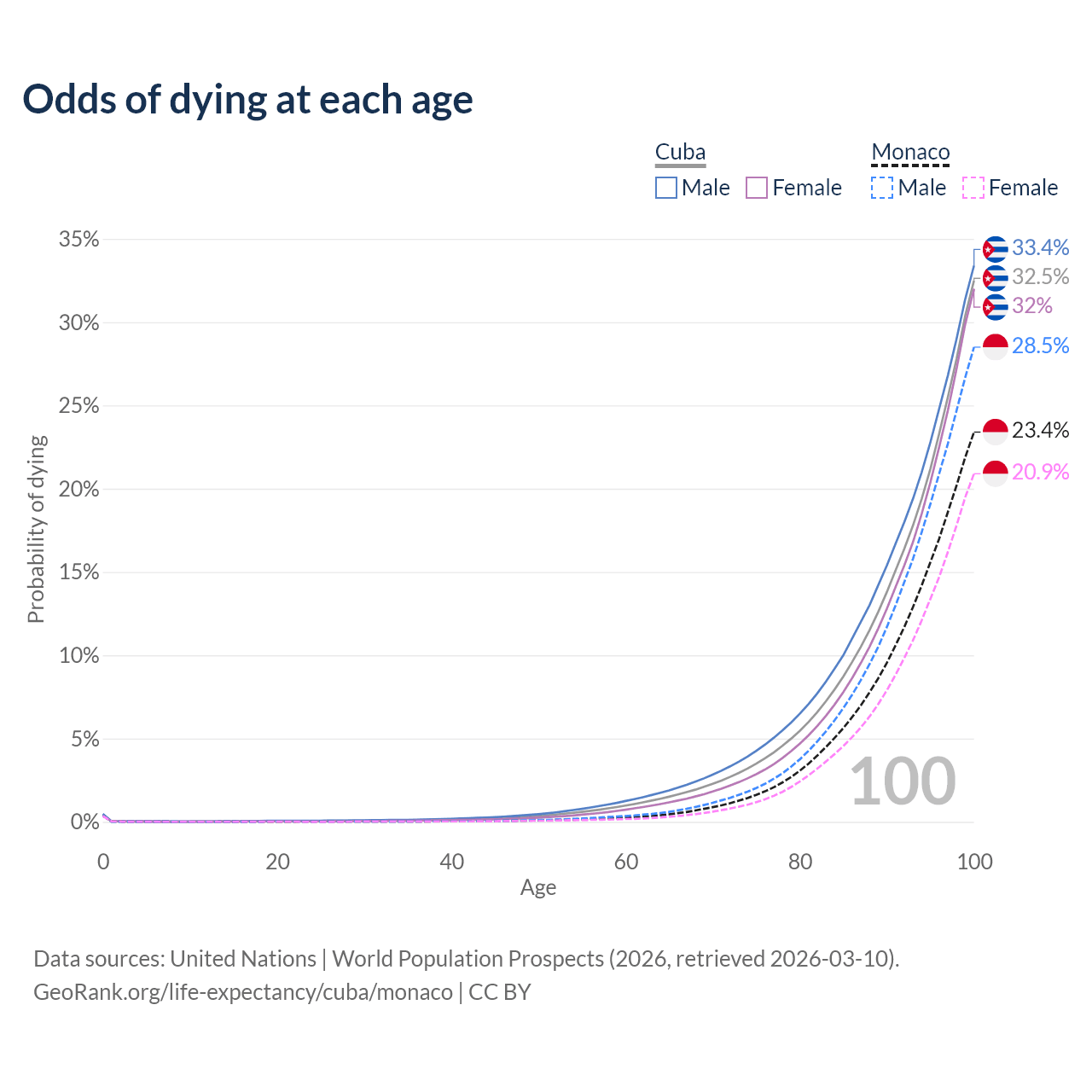 This life expectancy calculator shows the odds of living to 100, 95, 90, and below based on current age for both males and females in Cuba and Monaco, along with mean and median age of death. The calculations are based on the 2026 life tables (actuarial tables) from the UN World Population Prospects.