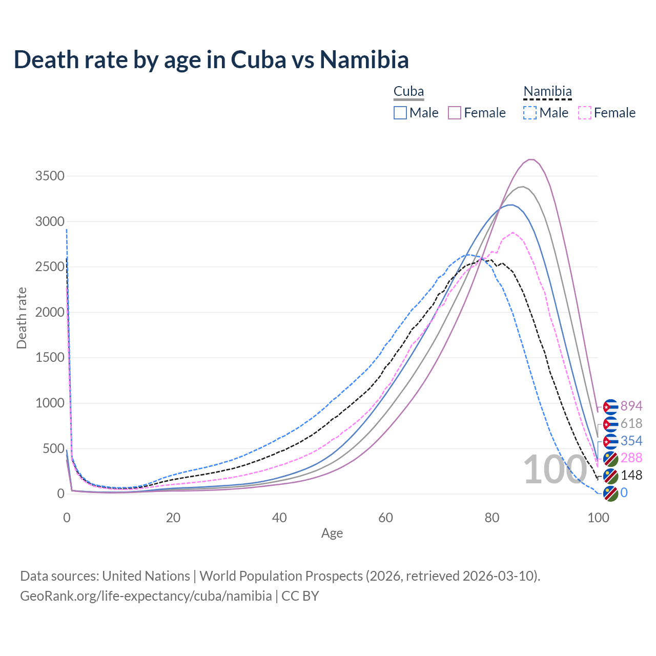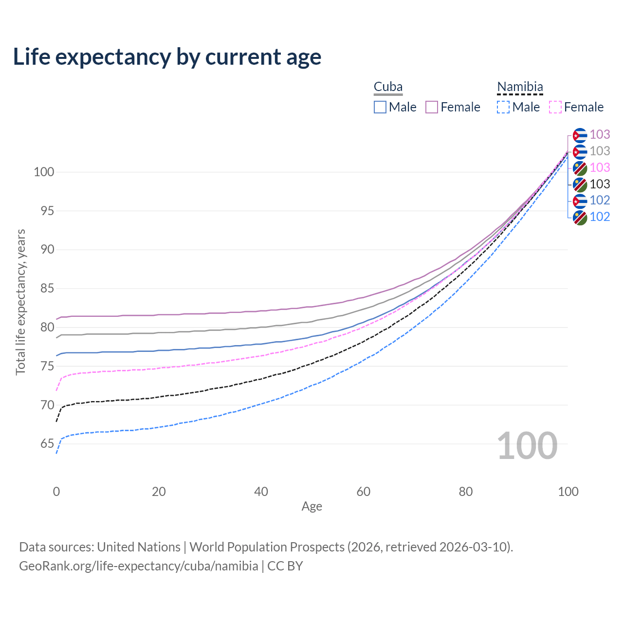This life expectancy calculator shows the odds of living to 100, 95, 90, and below based on current age for both males and females in Cuba and Namibia, along with mean and median age of death. The calculations are based on the 2026 life tables (actuarial tables) from the UN World Population Prospects.