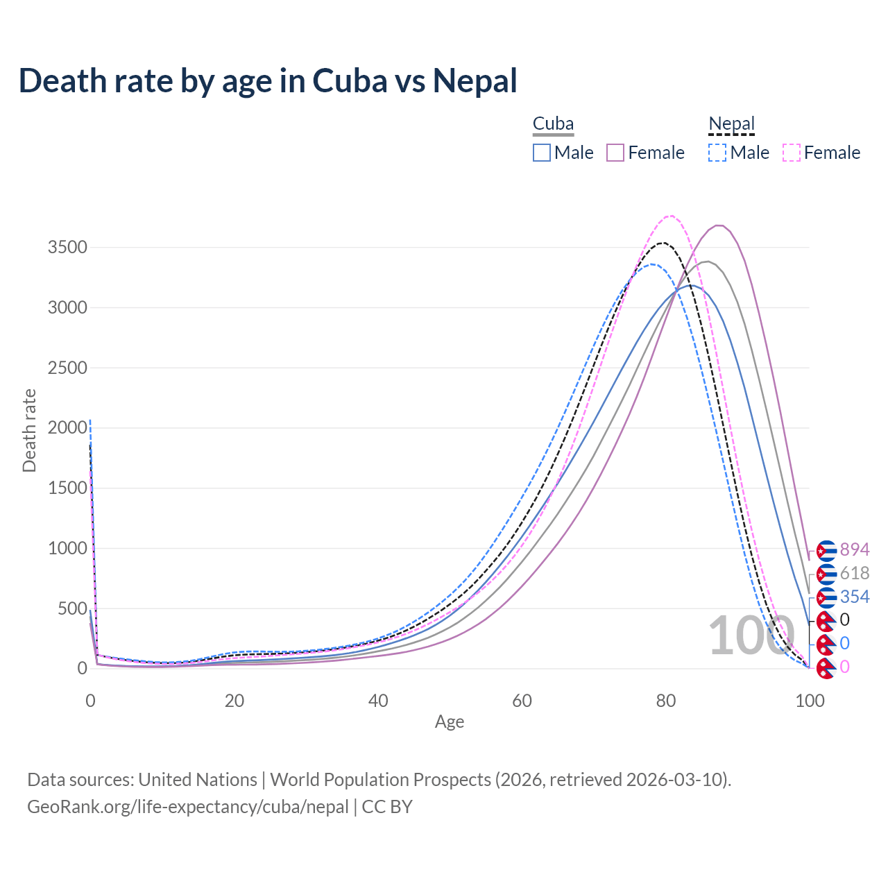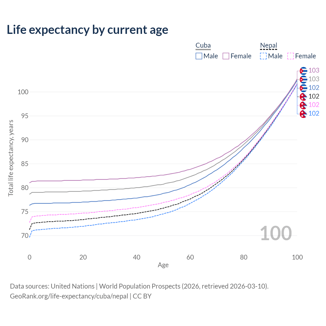 This life expectancy calculator shows the odds of living to 100, 95, 90, and below based on current age for both males and females in Cuba and Nepal, along with mean and median age of death. The calculations are based on the 2026 life tables (actuarial tables) from the UN World Population Prospects.