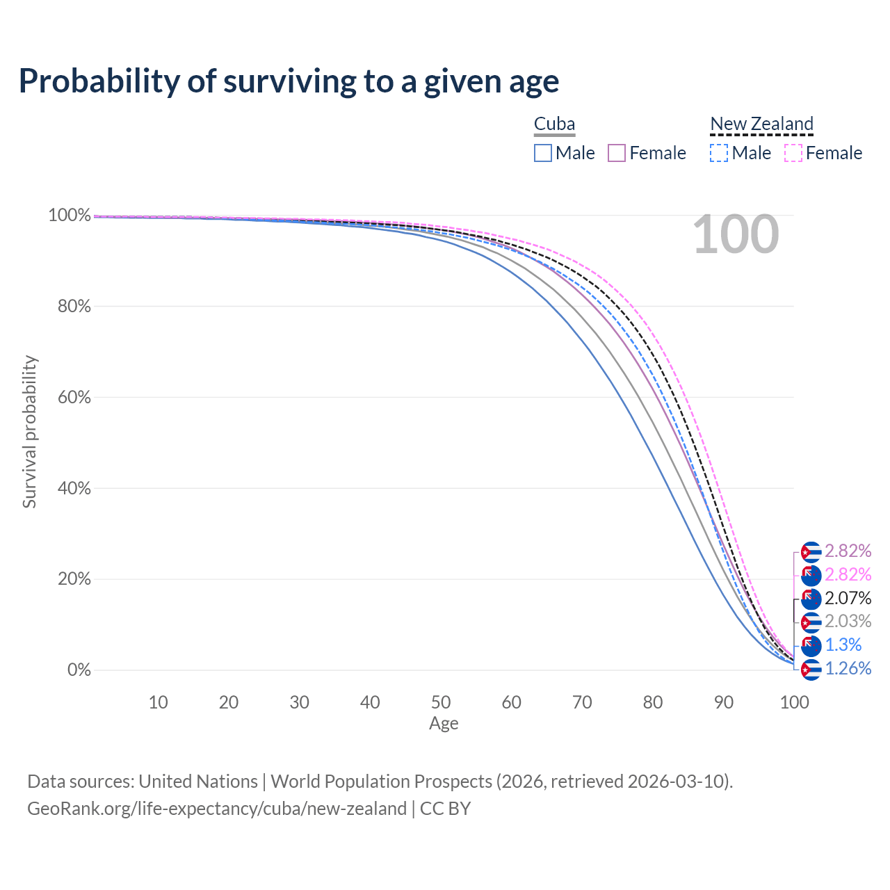 This life expectancy calculator shows the odds of living to 100, 95, 90, and below based on current age for both males and females in Cuba and New Zealand, along with mean and median age of death. The calculations are based on the 2026 life tables (actuarial tables) from the UN World Population Prospects.