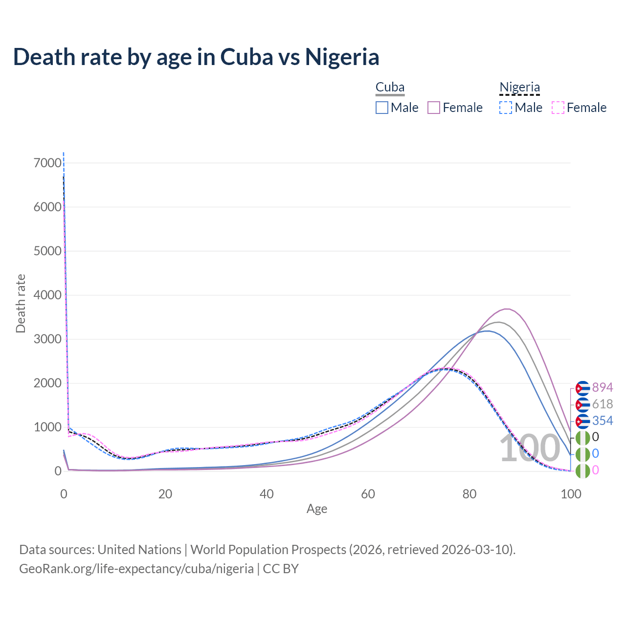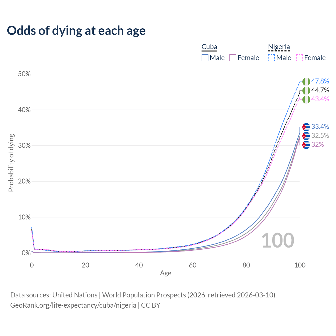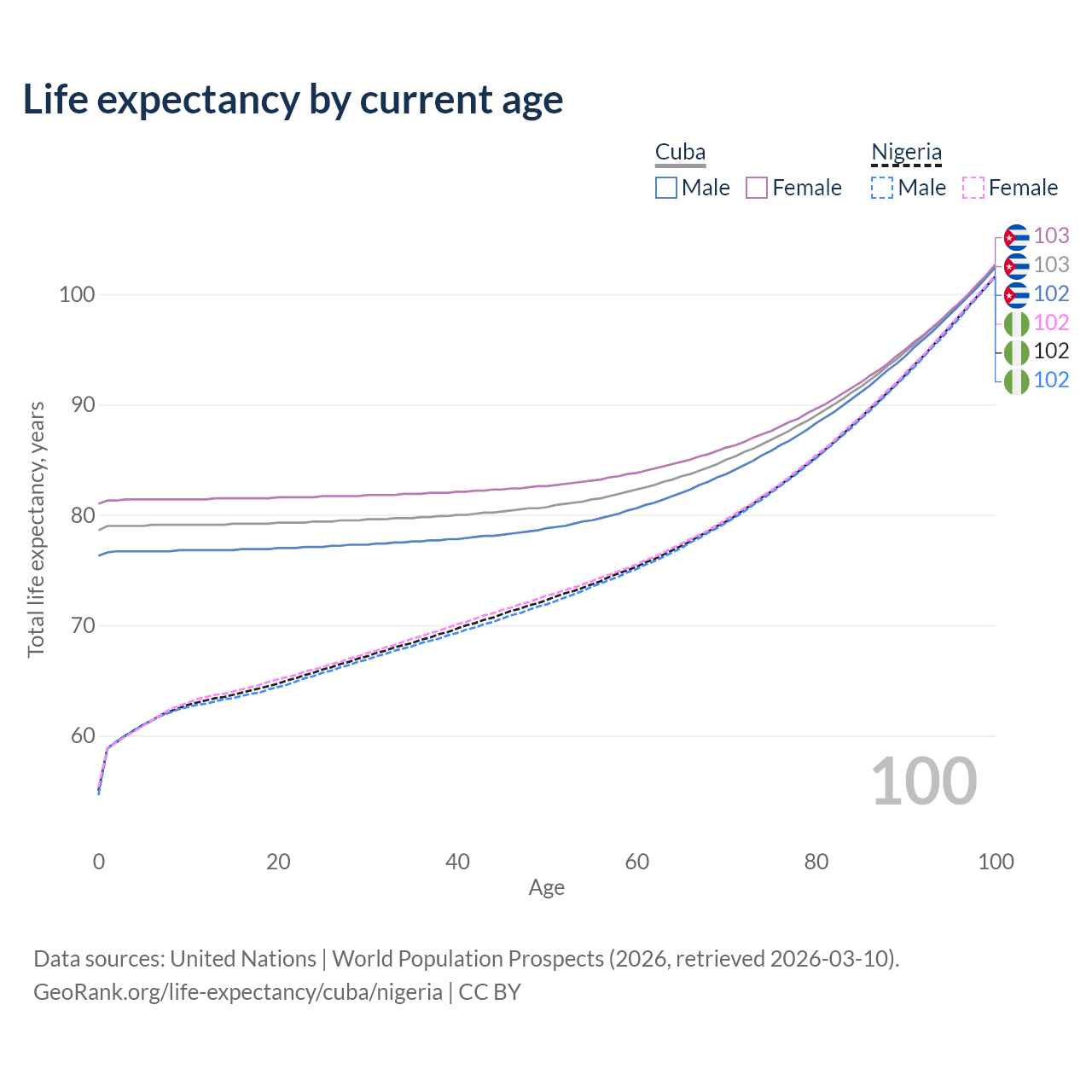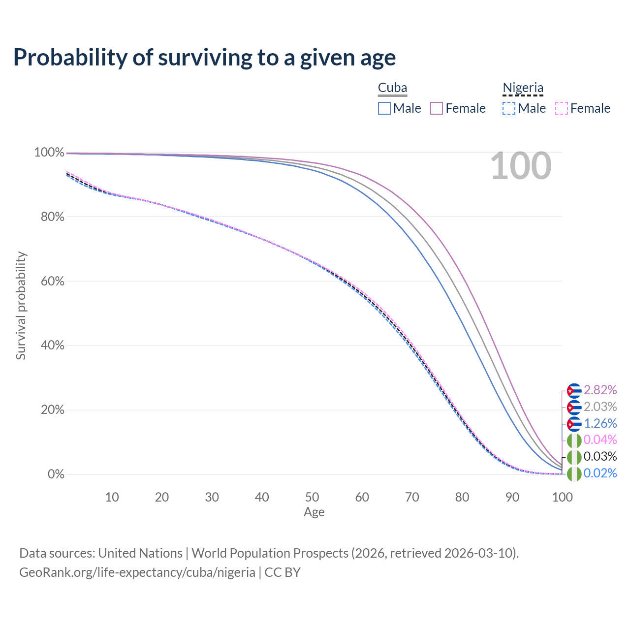 This life expectancy calculator shows the odds of living to 100, 95, 90, and below based on current age for both males and females in Cuba and Nigeria, along with mean and median age of death. The calculations are based on the 2026 life tables (actuarial tables) from the UN World Population Prospects.