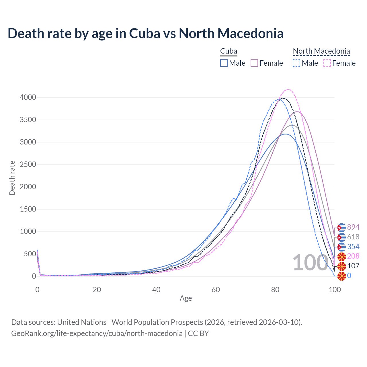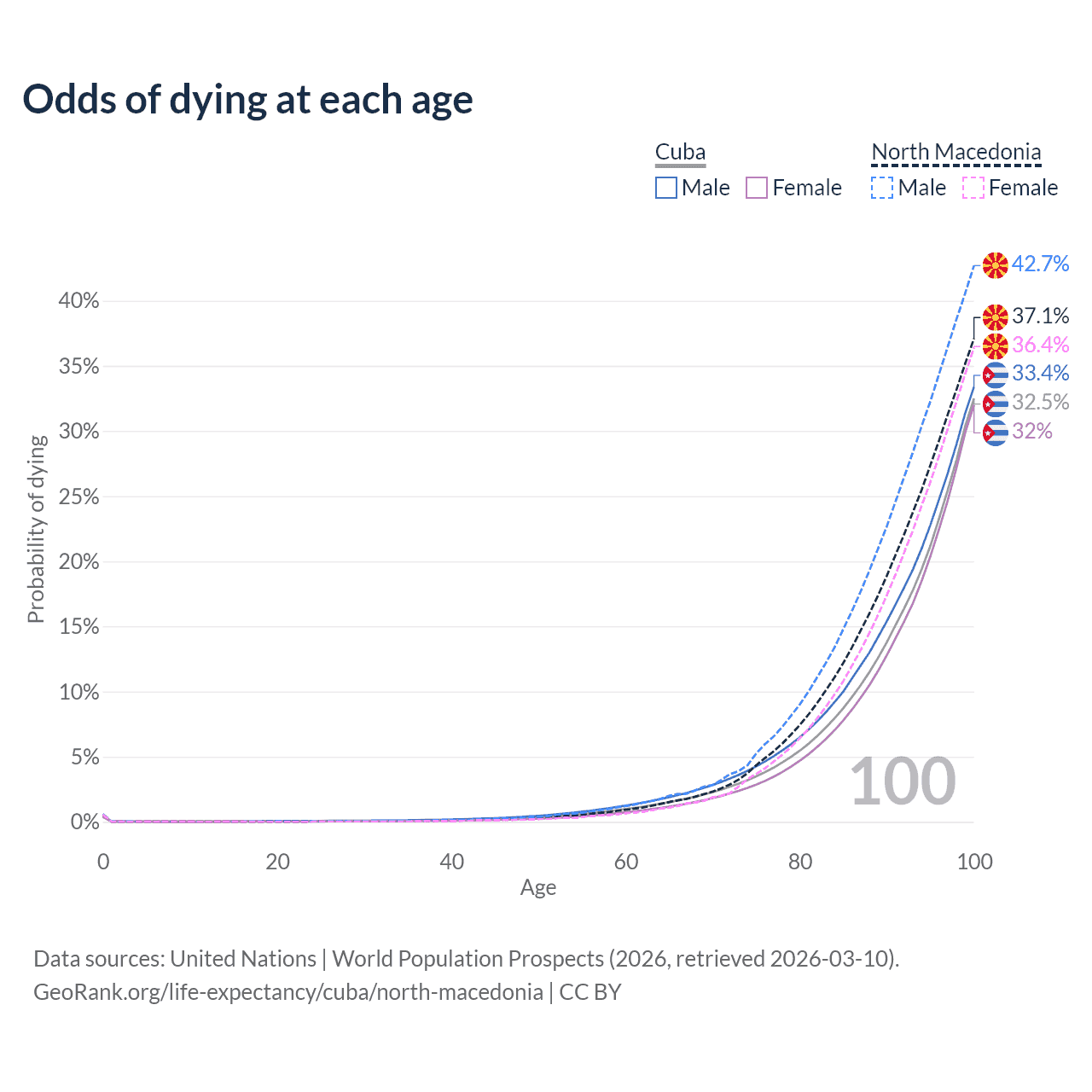 This life expectancy calculator shows the odds of living to 100, 95, 90, and below based on current age for both males and females in Cuba and North Macedonia, along with mean and median age of death. The calculations are based on the 2026 life tables (actuarial tables) from the UN World Population Prospects.