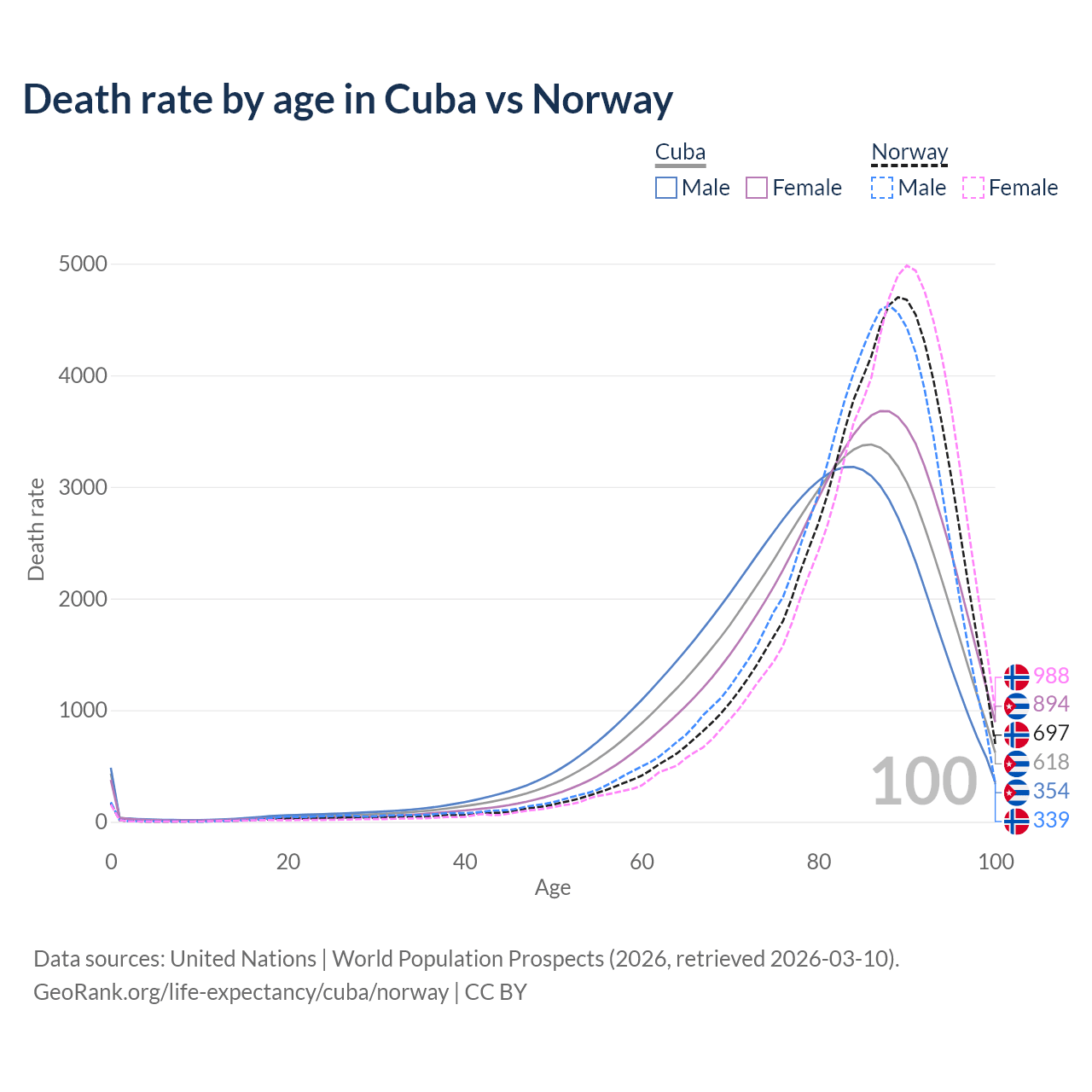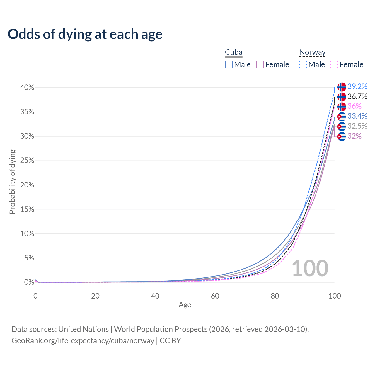 This life expectancy calculator shows the odds of living to 100, 95, 90, and below based on current age for both males and females in Cuba and Norway, along with mean and median age of death. The calculations are based on the 2026 life tables (actuarial tables) from the UN World Population Prospects.