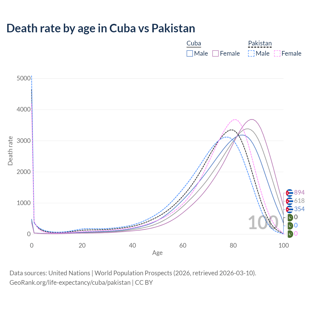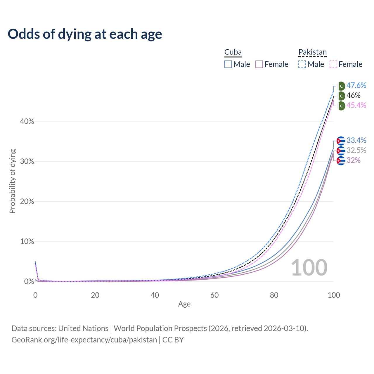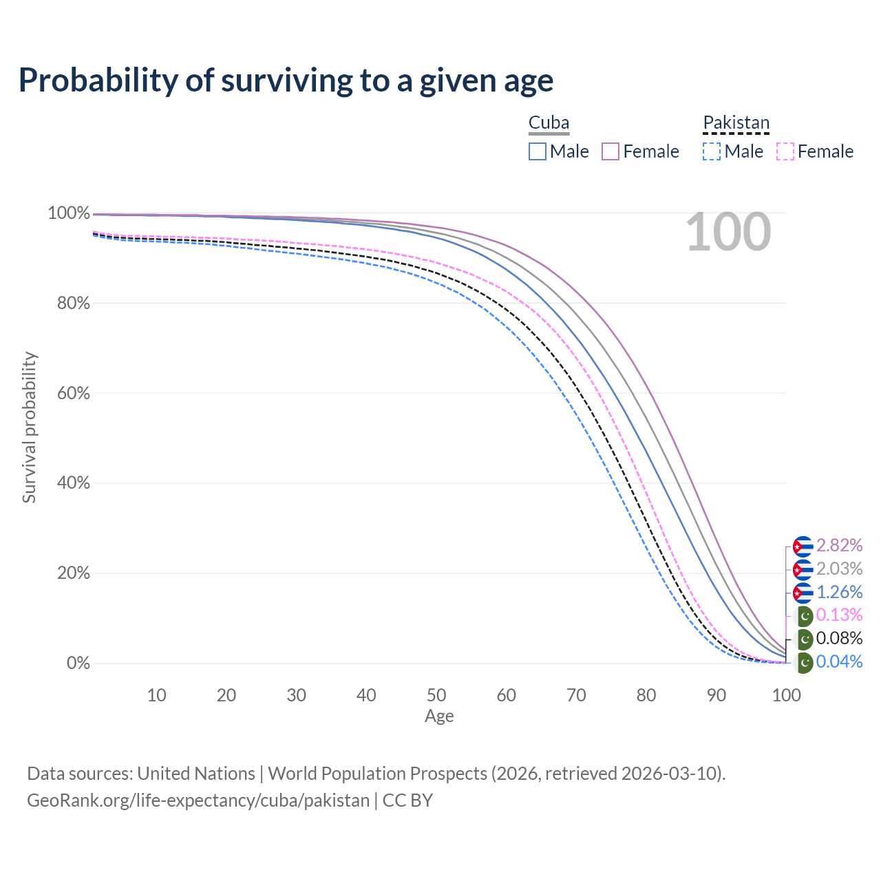 This life expectancy calculator shows the odds of living to 100, 95, 90, and below based on current age for both males and females in Cuba and Pakistan, along with mean and median age of death. The calculations are based on the 2026 life tables (actuarial tables) from the UN World Population Prospects.