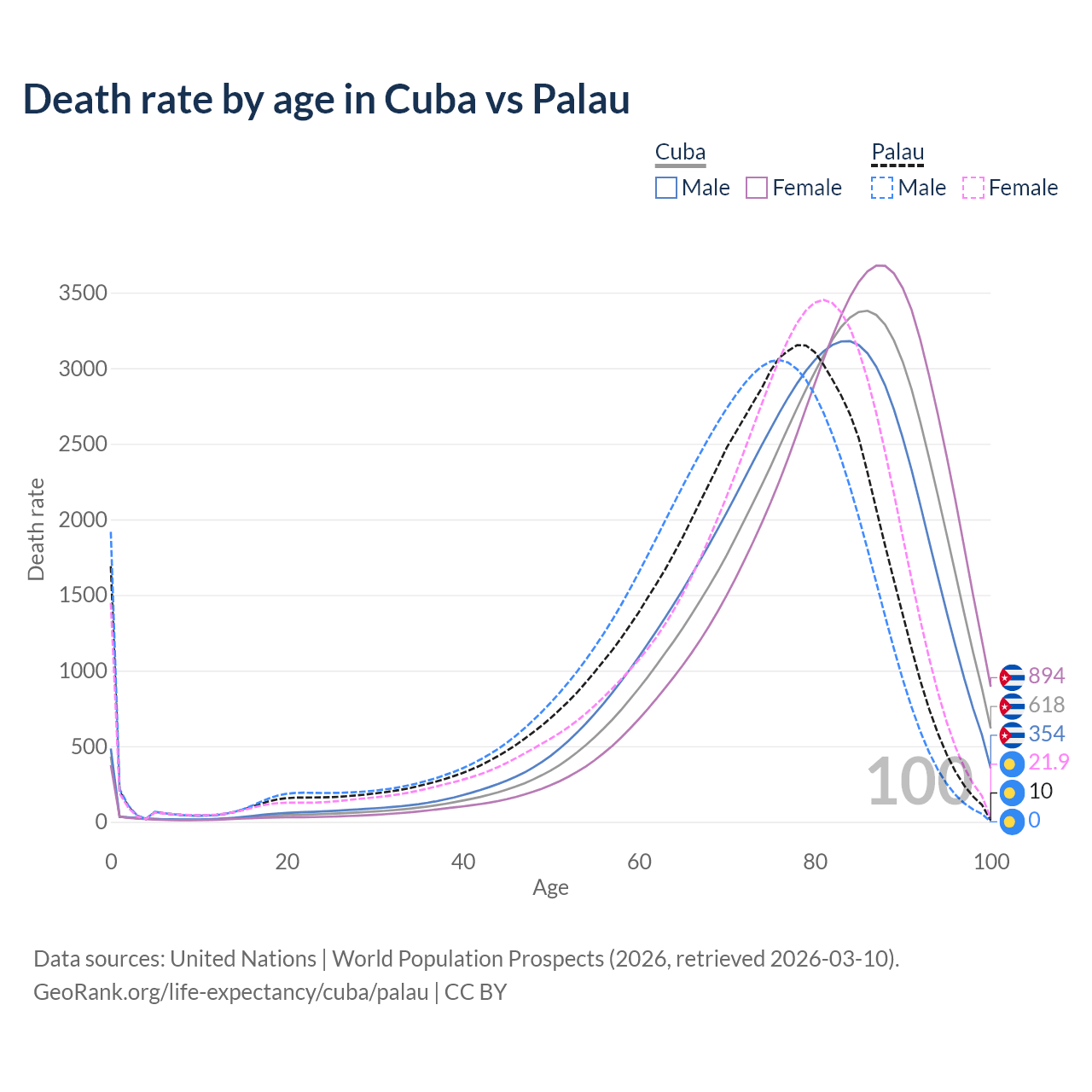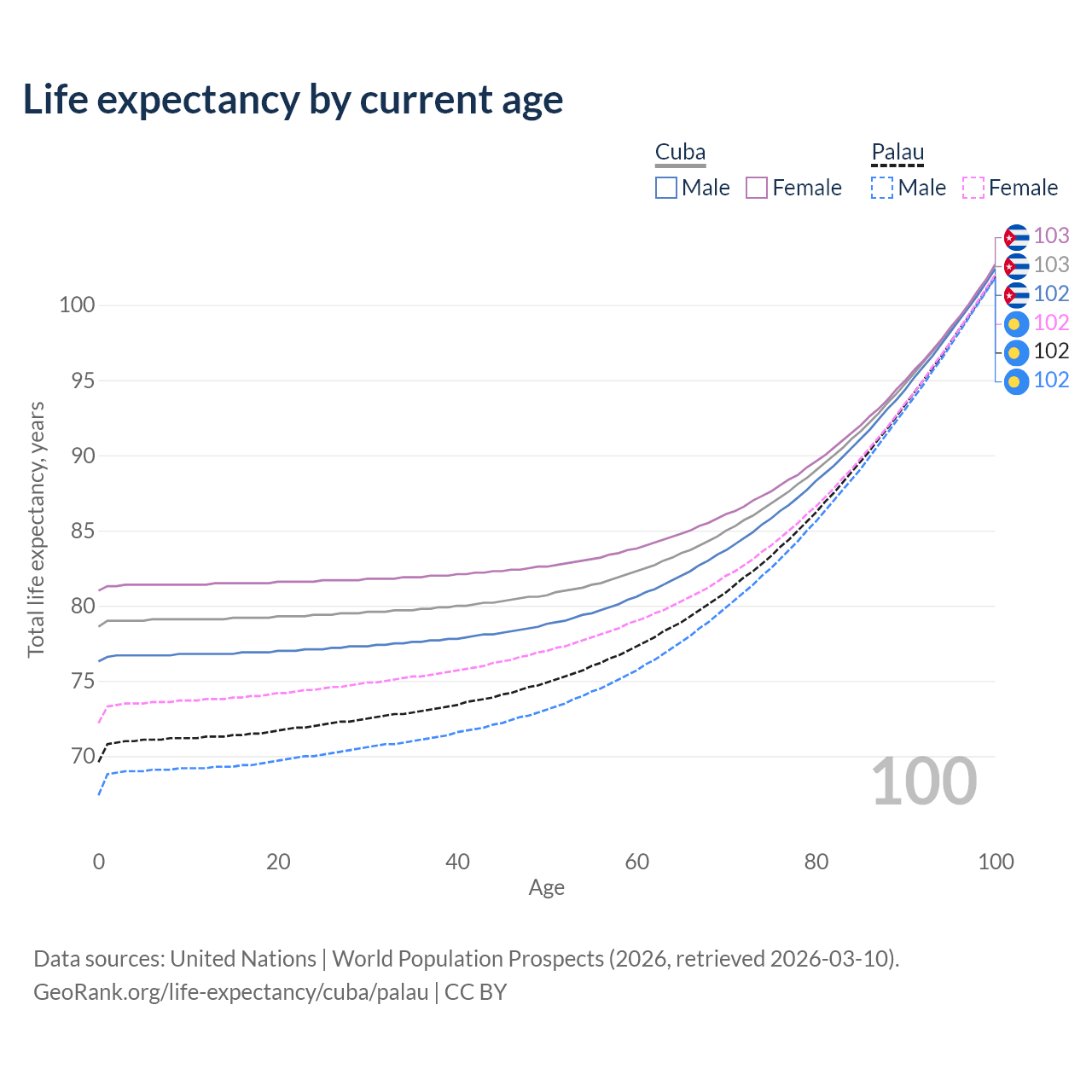 This life expectancy calculator shows the odds of living to 100, 95, 90, and below based on current age for both males and females in Cuba and Palau, along with mean and median age of death. The calculations are based on the 2026 life tables (actuarial tables) from the UN World Population Prospects.