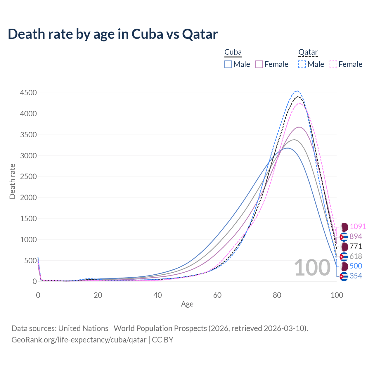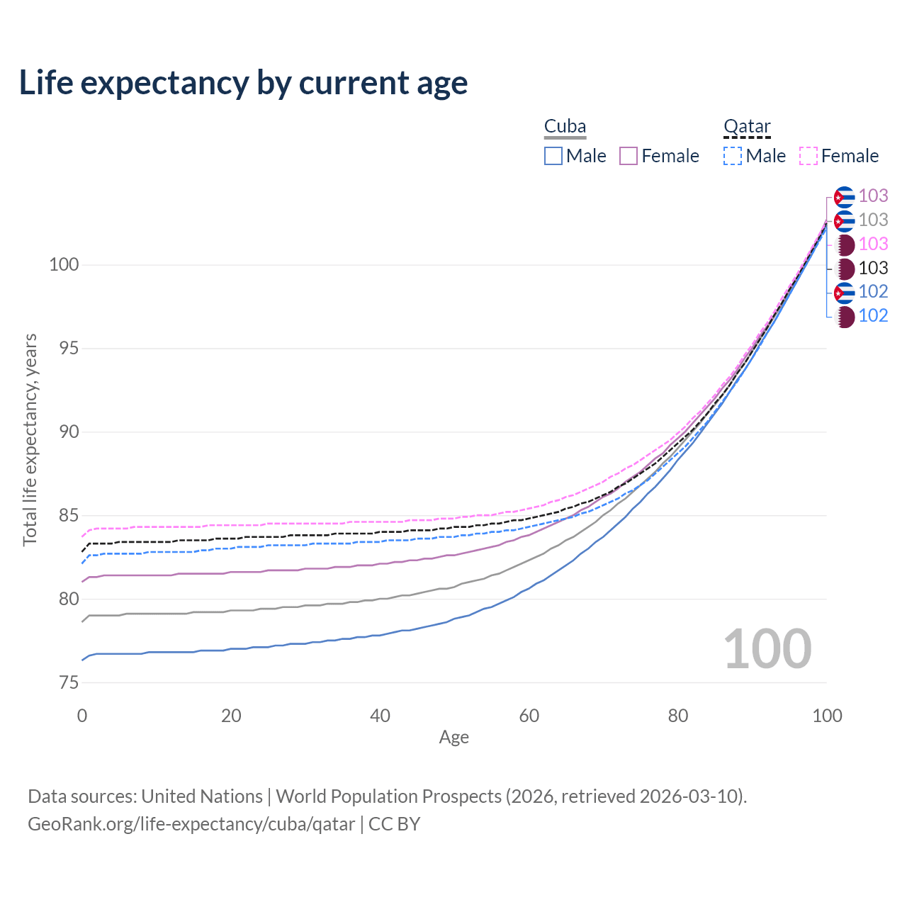 This life expectancy calculator shows the odds of living to 100, 95, 90, and below based on current age for both males and females in Cuba and Qatar, along with mean and median age of death. The calculations are based on the 2026 life tables (actuarial tables) from the UN World Population Prospects.