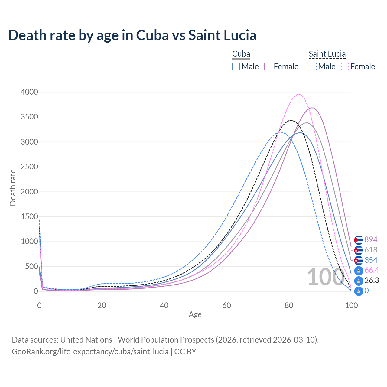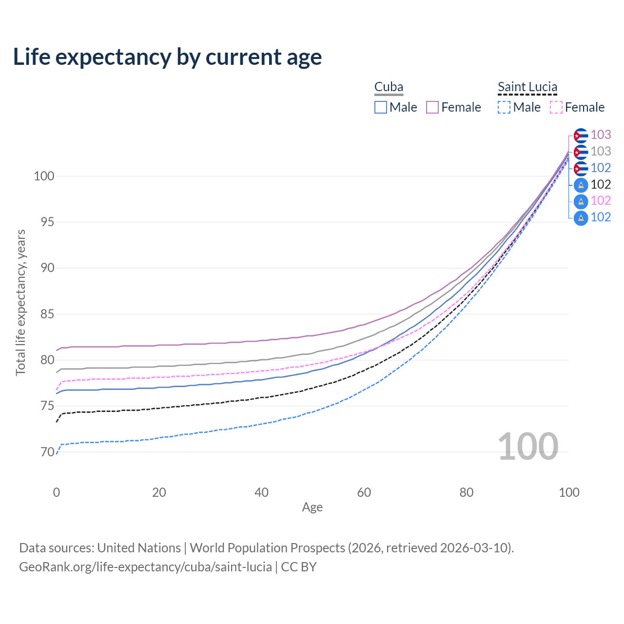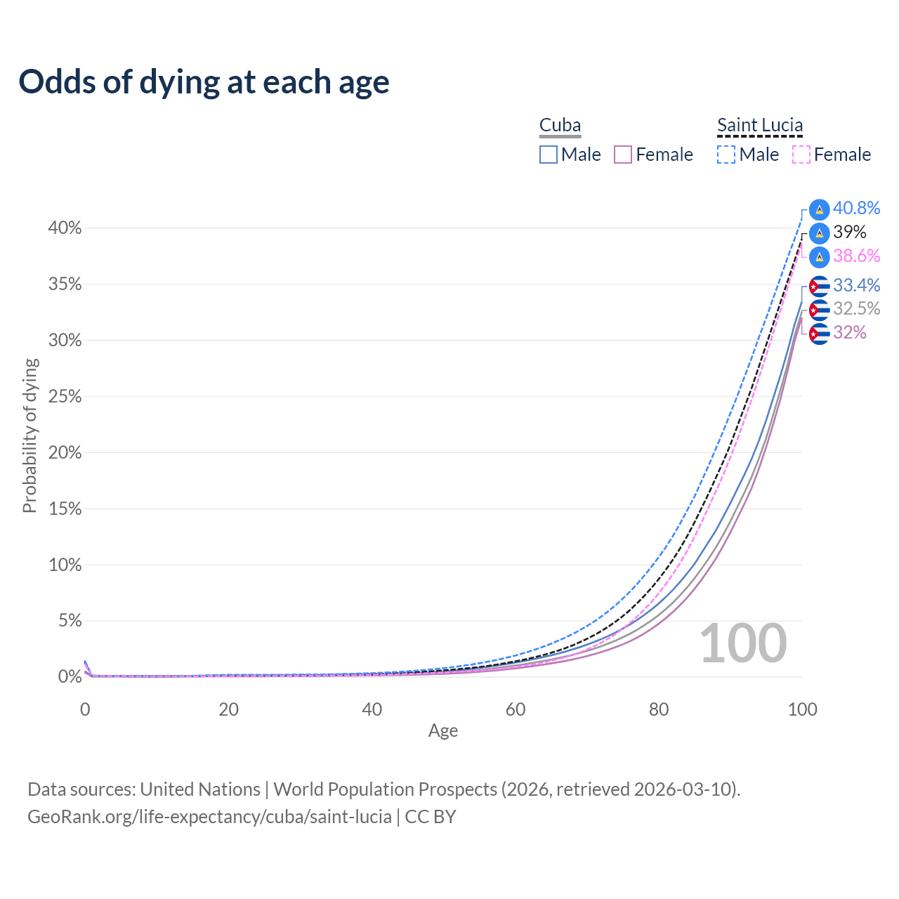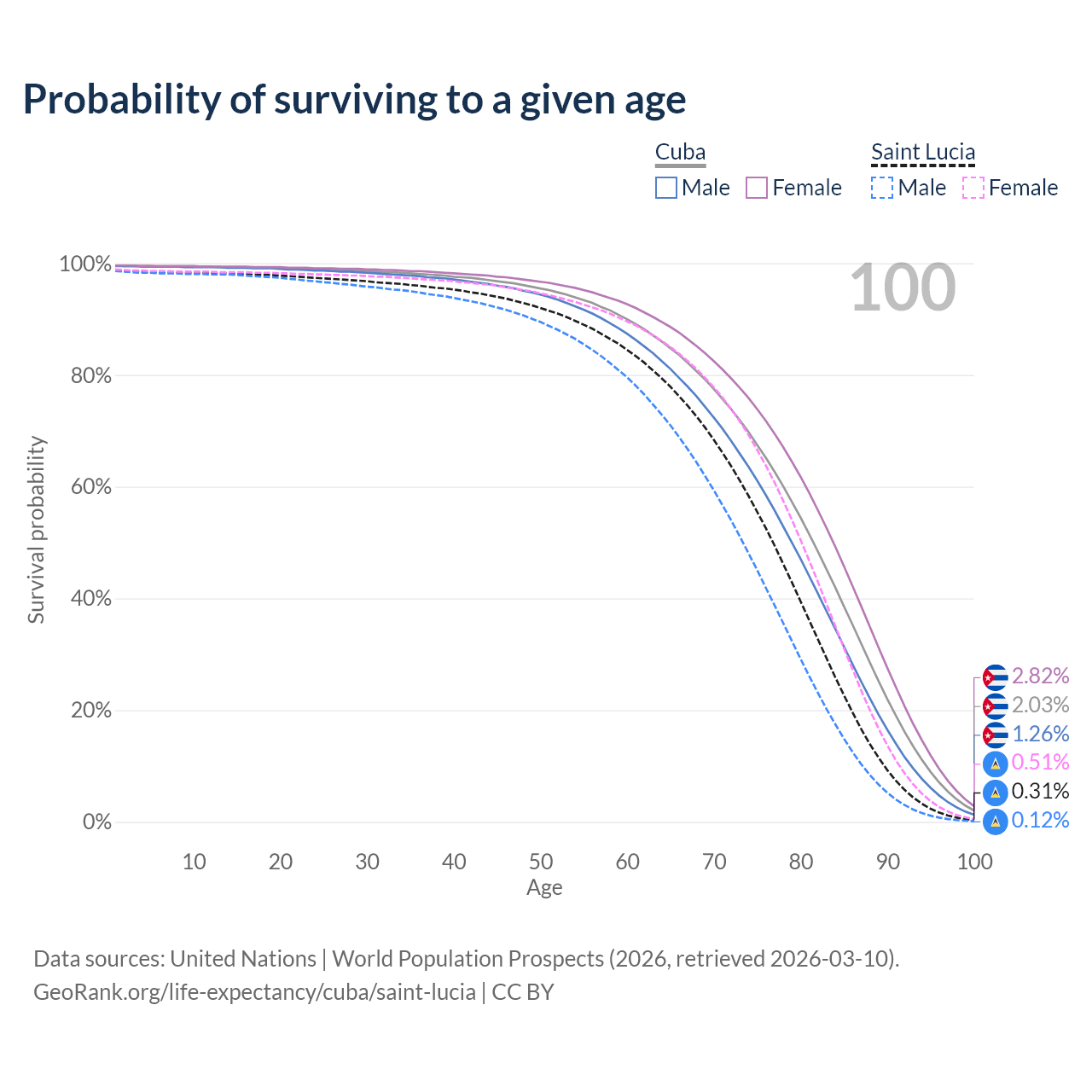 This life expectancy calculator shows the odds of living to 100, 95, 90, and below based on current age for both males and females in Cuba and Saint Lucia, along with mean and median age of death. The calculations are based on the 2026 life tables (actuarial tables) from the UN World Population Prospects.