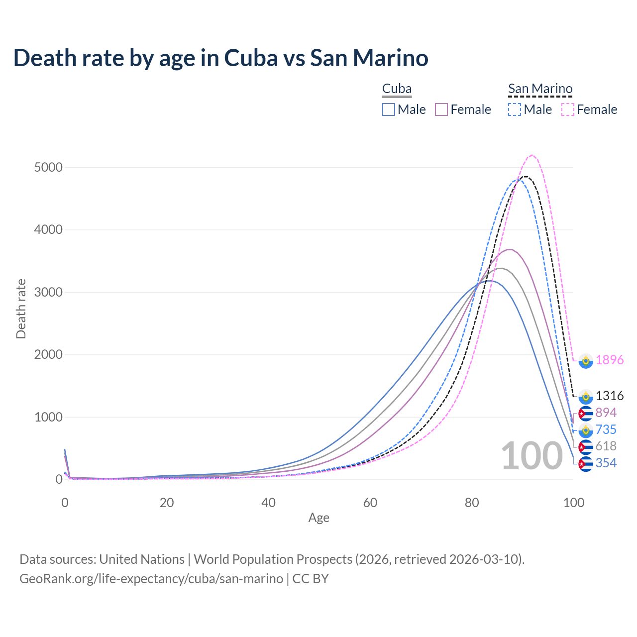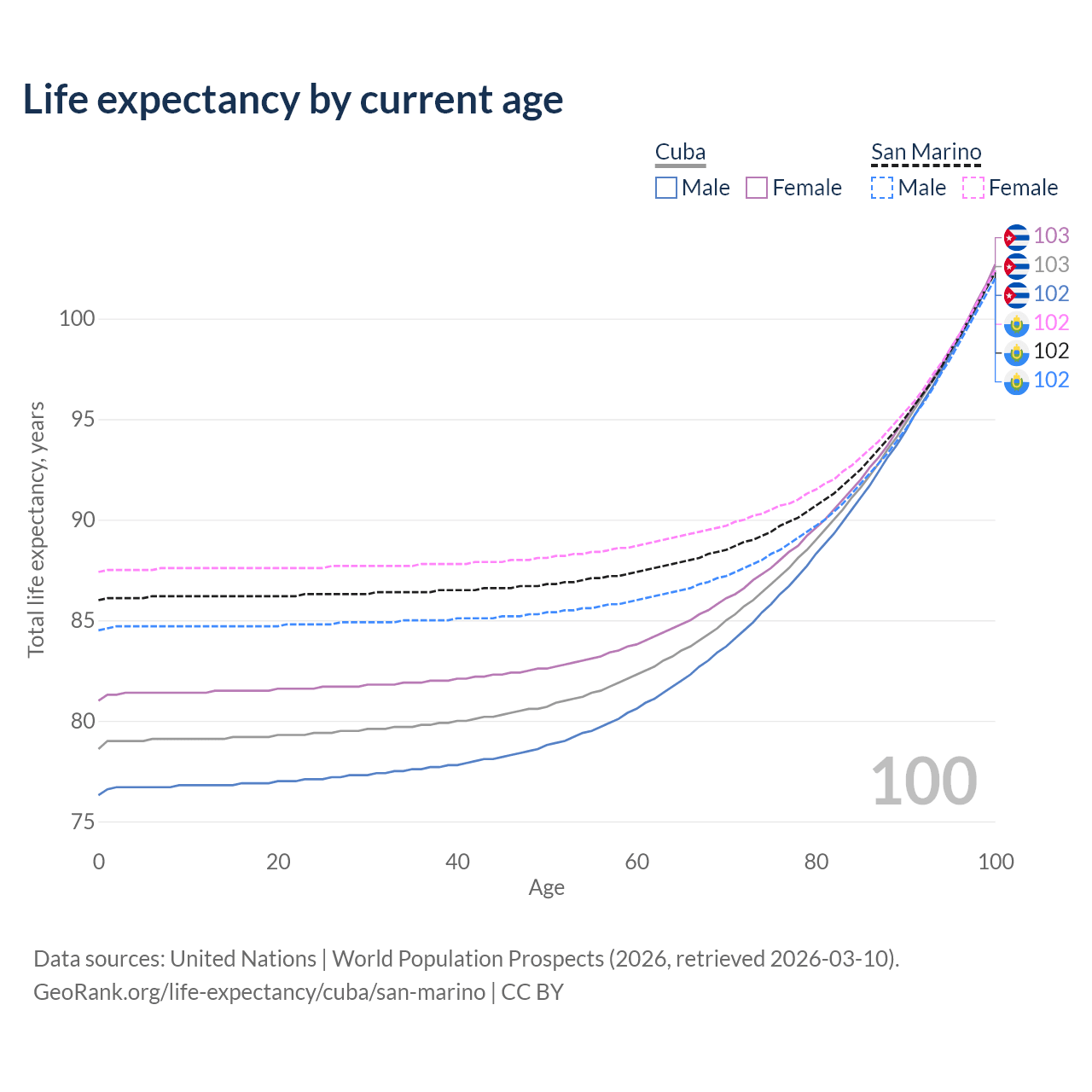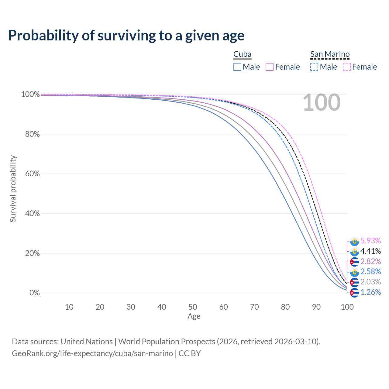 This life expectancy calculator shows the odds of living to 100, 95, 90, and below based on current age for both males and females in Cuba and San Marino, along with mean and median age of death. The calculations are based on the 2026 life tables (actuarial tables) from the UN World Population Prospects.