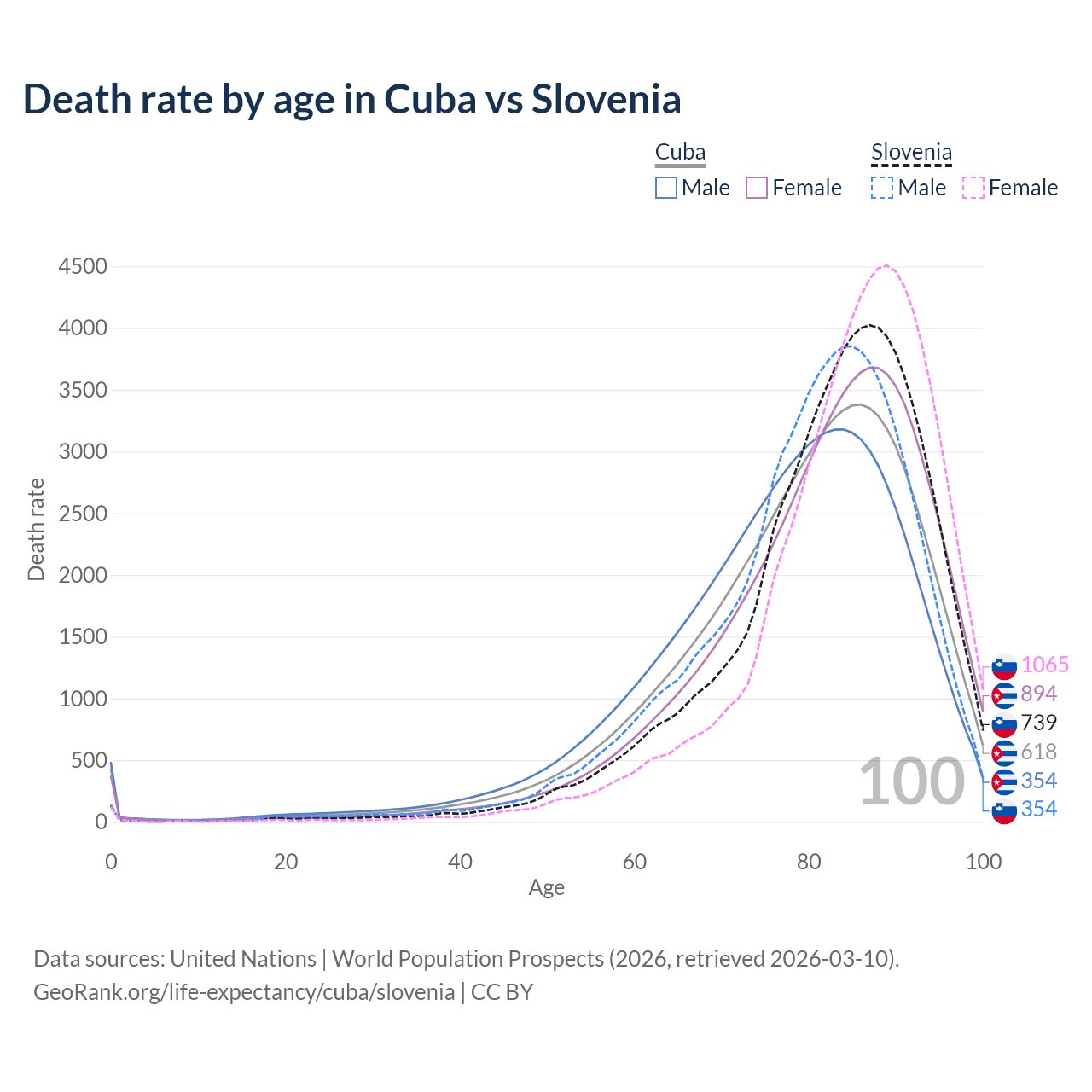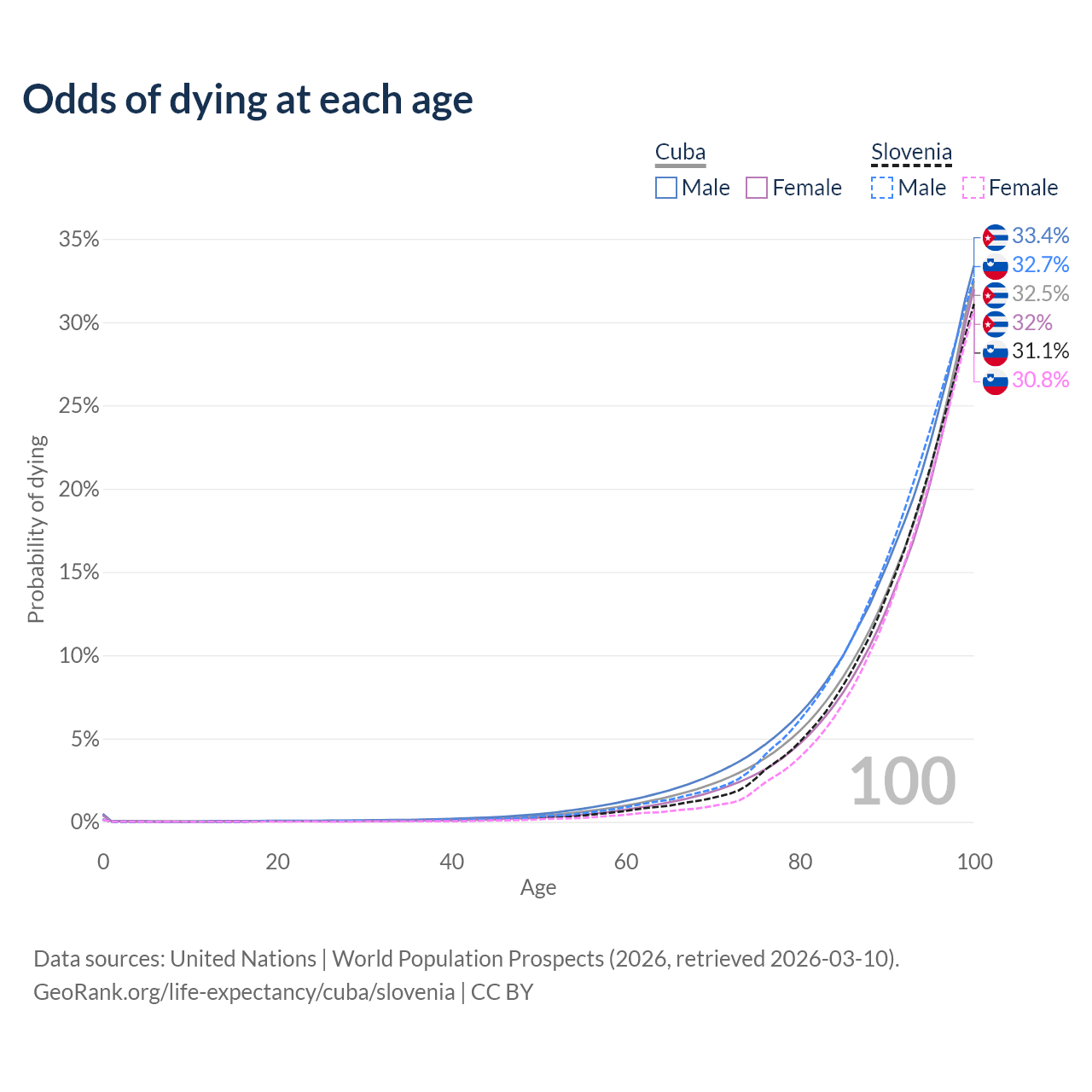 This life expectancy calculator shows the odds of living to 100, 95, 90, and below based on current age for both males and females in Cuba and Slovenia, along with mean and median age of death. The calculations are based on the 2026 life tables (actuarial tables) from the UN World Population Prospects.