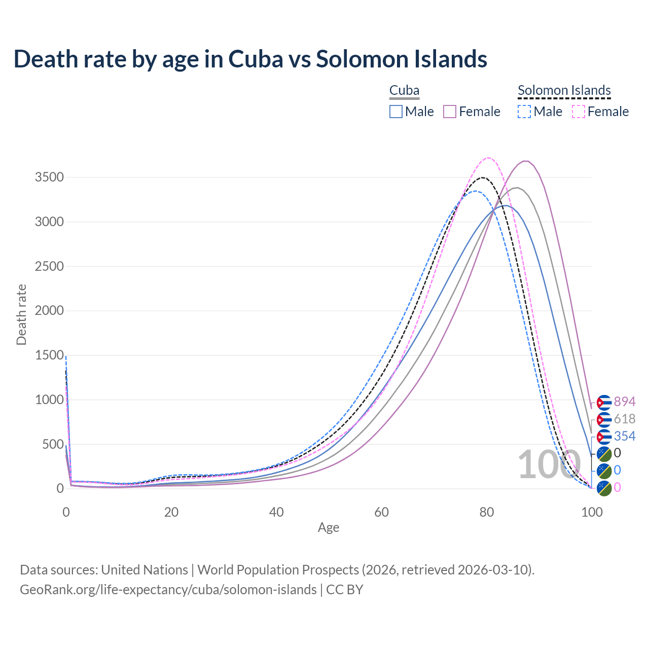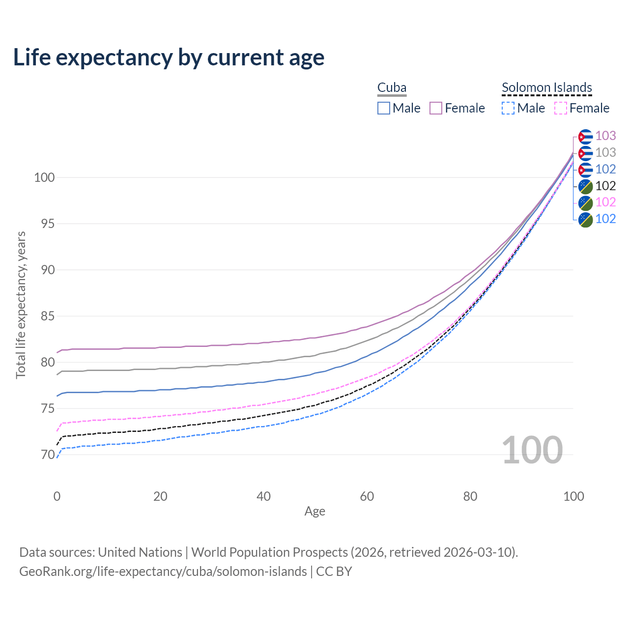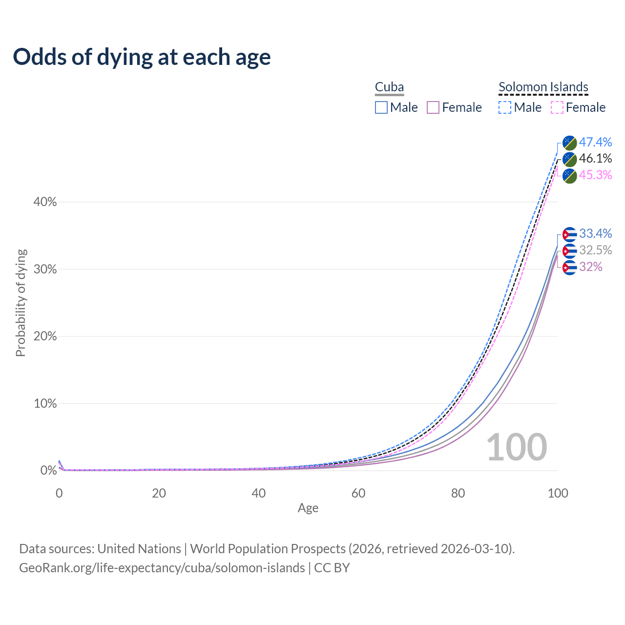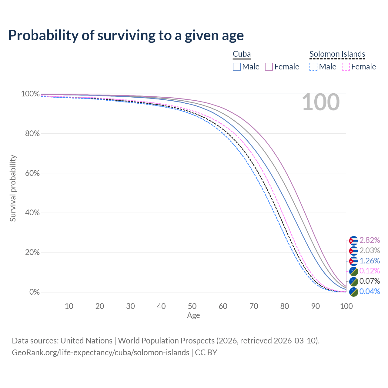This life expectancy calculator shows the odds of living to 100, 95, 90, and below based on current age for both males and females in Cuba and the Solomon Islands, along with mean and median age of death. The calculations are based on the 2026 life tables (actuarial tables) from the UN World Population Prospects.