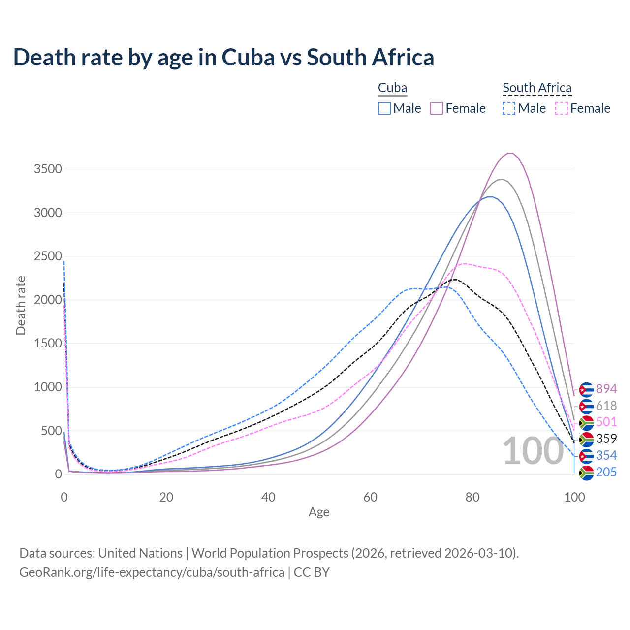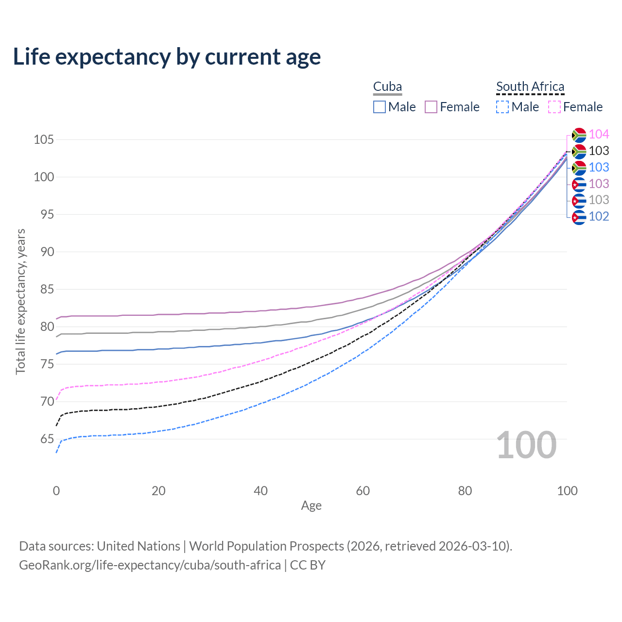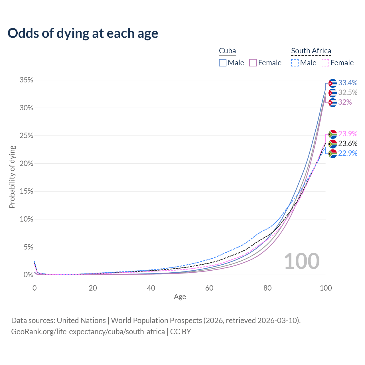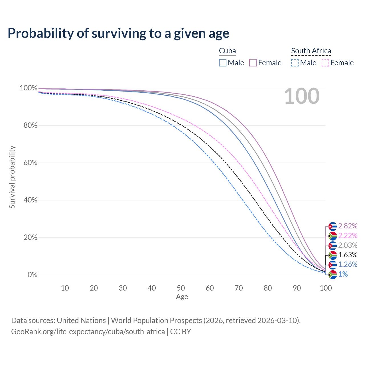 This life expectancy calculator shows the odds of living to 100, 95, 90, and below based on current age for both males and females in Cuba and South Africa, along with mean and median age of death. The calculations are based on the 2026 life tables (actuarial tables) from the UN World Population Prospects.