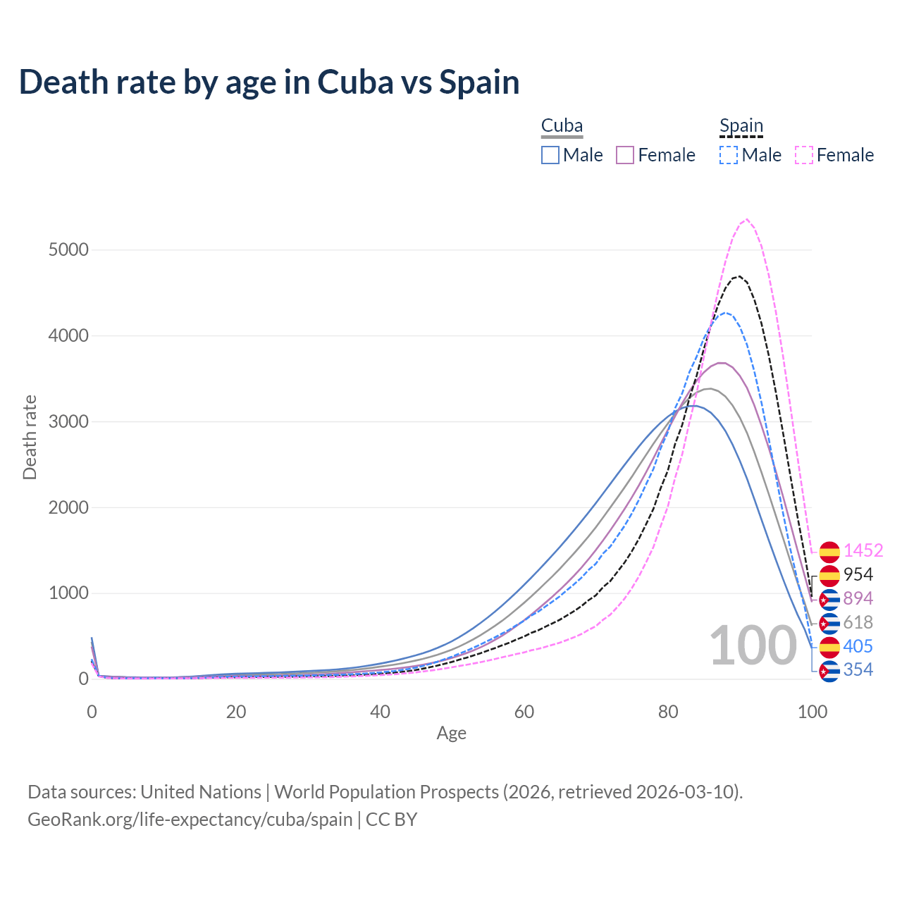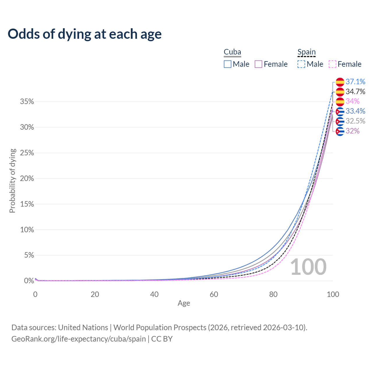 This life expectancy calculator shows the odds of living to 100, 95, 90, and below based on current age for both males and females in Cuba and Spain, along with mean and median age of death. The calculations are based on the 2026 life tables (actuarial tables) from the UN World Population Prospects.