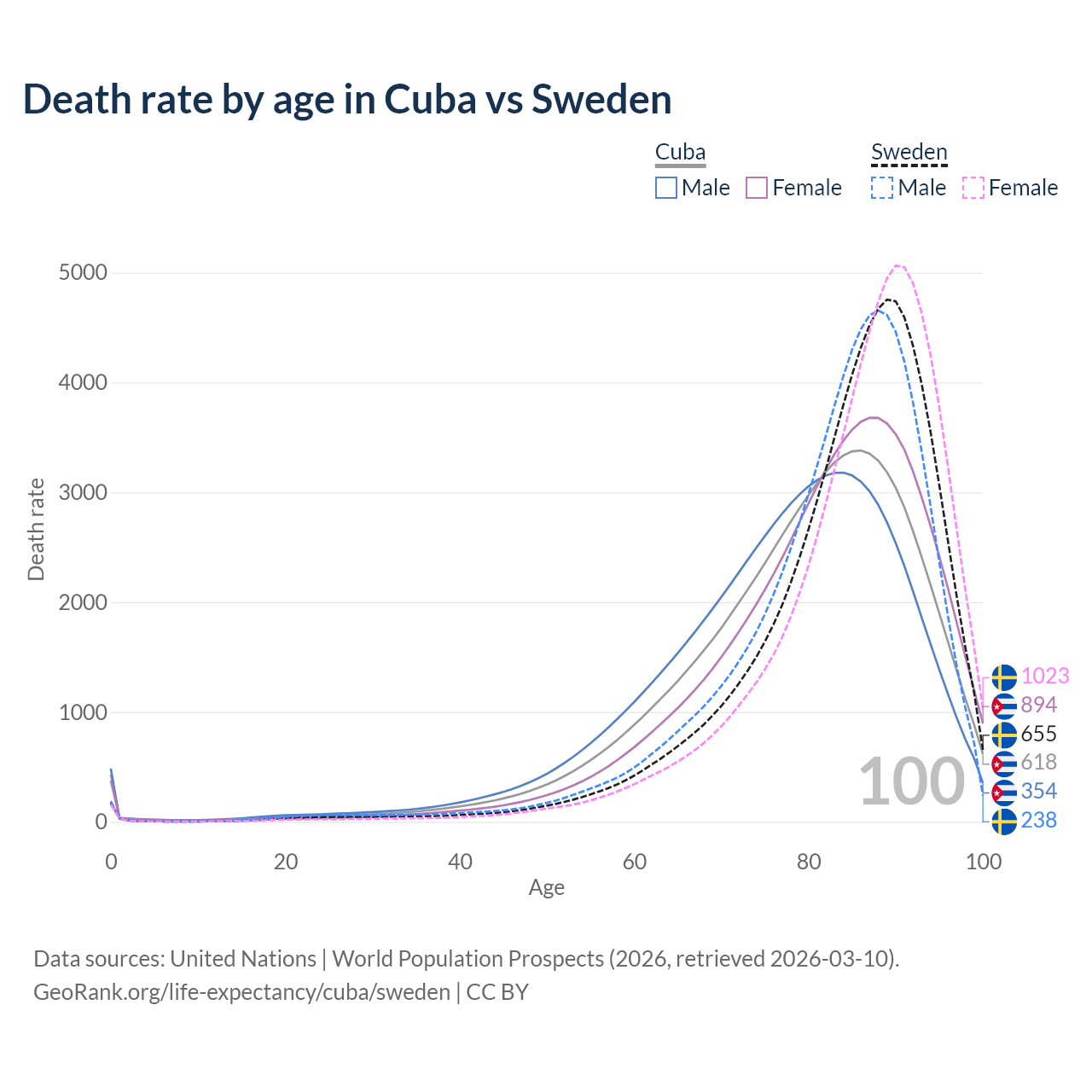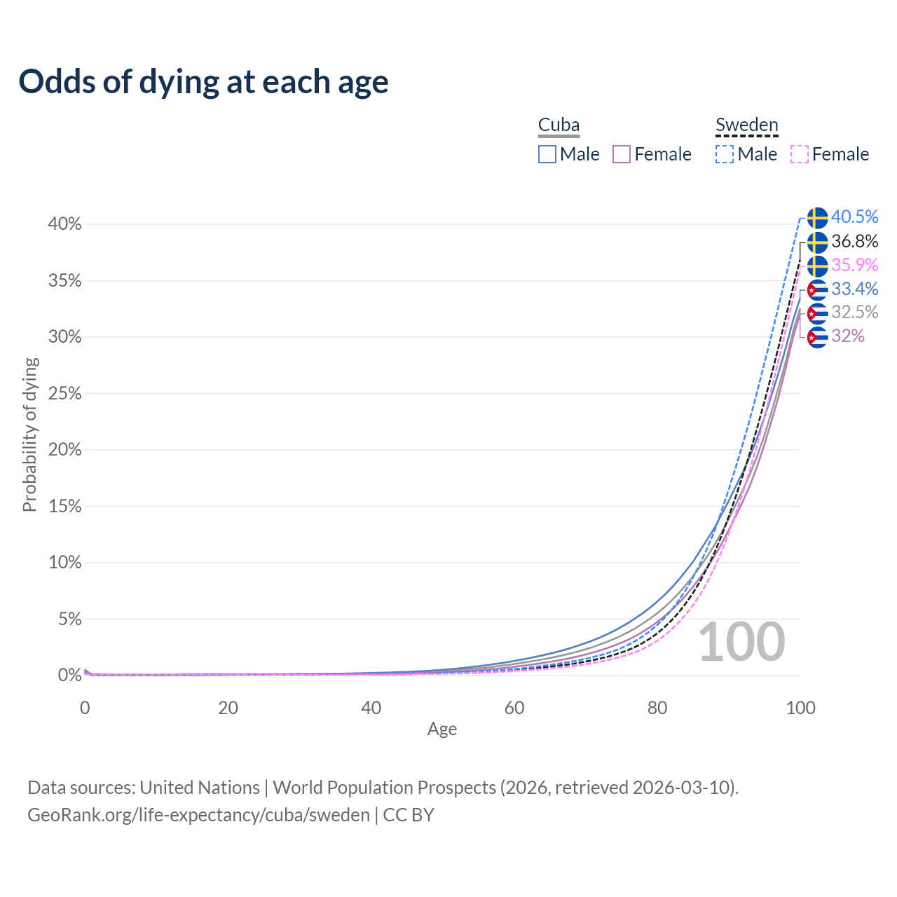 This life expectancy calculator shows the odds of living to 100, 95, 90, and below based on current age for both males and females in Cuba and Sweden, along with mean and median age of death. The calculations are based on the 2026 life tables (actuarial tables) from the UN World Population Prospects.