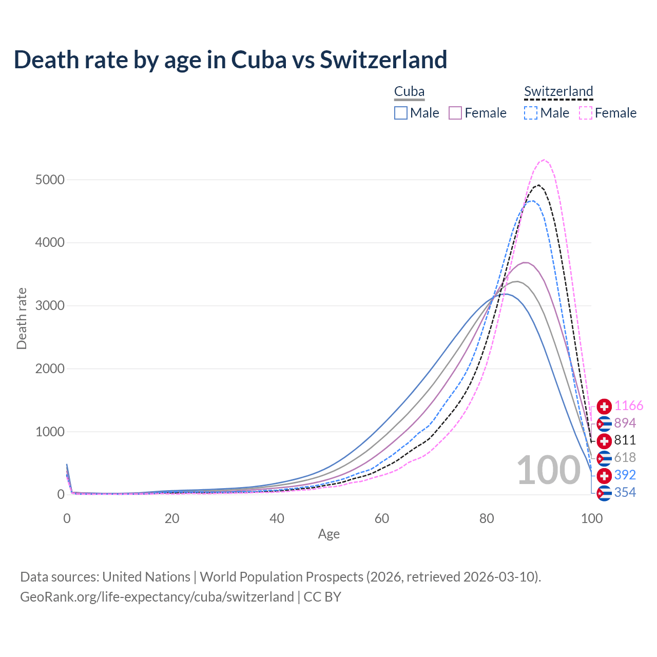 In Cuba, the most common age of death is 86, compared to 90 in Switzerland. The median age of death is 81.5 in Cuba and 87.2 in Switzerland, meaning only half of each cohort is expected to live past that age.
