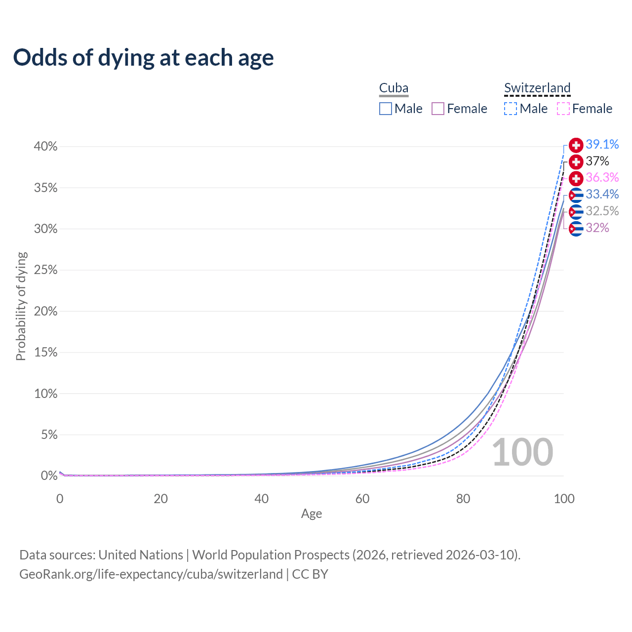 This life expectancy calculator shows the odds of living to 100, 95, 90, and below based on current age for both males and females in Cuba and Switzerland, along with mean and median age of death. The calculations are based on the 2026 life tables (actuarial tables) from the UN World Population Prospects.
