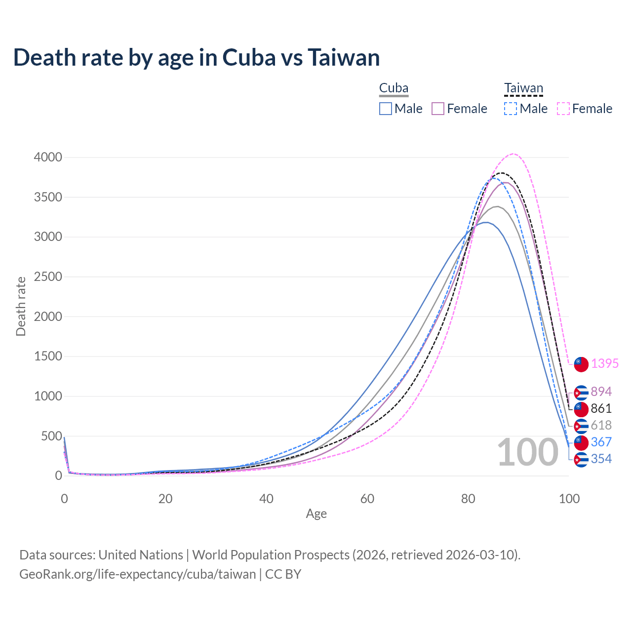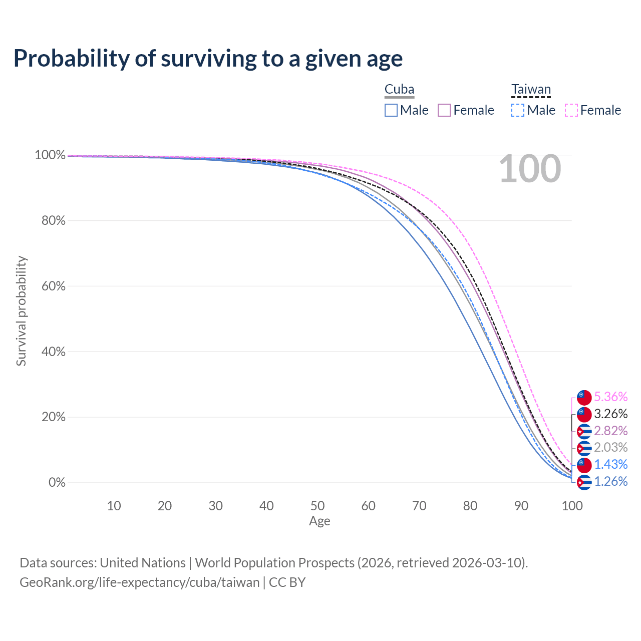 This life expectancy calculator shows the odds of living to 100, 95, 90, and below based on current age for both males and females in Cuba and Taiwan, along with mean and median age of death. The calculations are based on the 2026 life tables (actuarial tables) from the UN World Population Prospects.