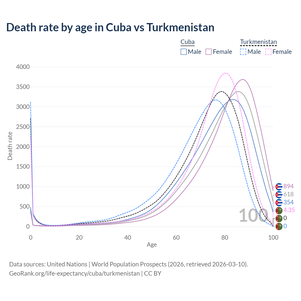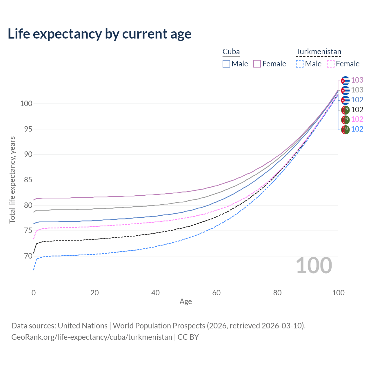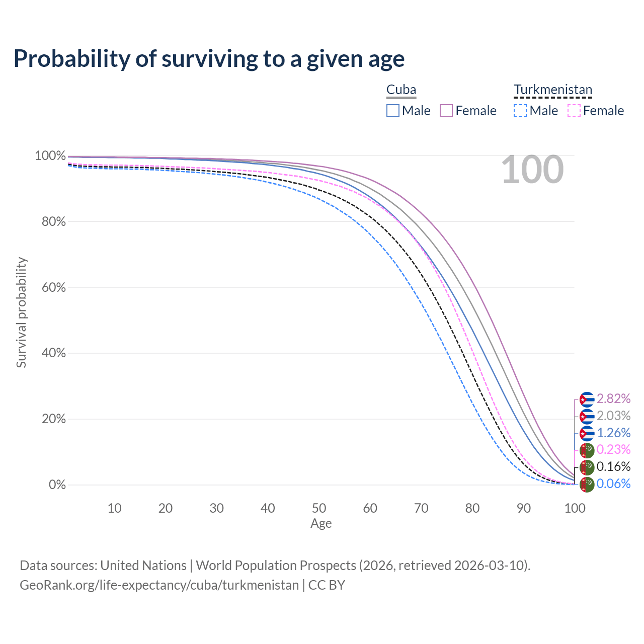 This life expectancy calculator shows the odds of living to 100, 95, 90, and below based on current age for both males and females in Cuba and Turkmenistan, along with mean and median age of death. The calculations are based on the 2026 life tables (actuarial tables) from the UN World Population Prospects.