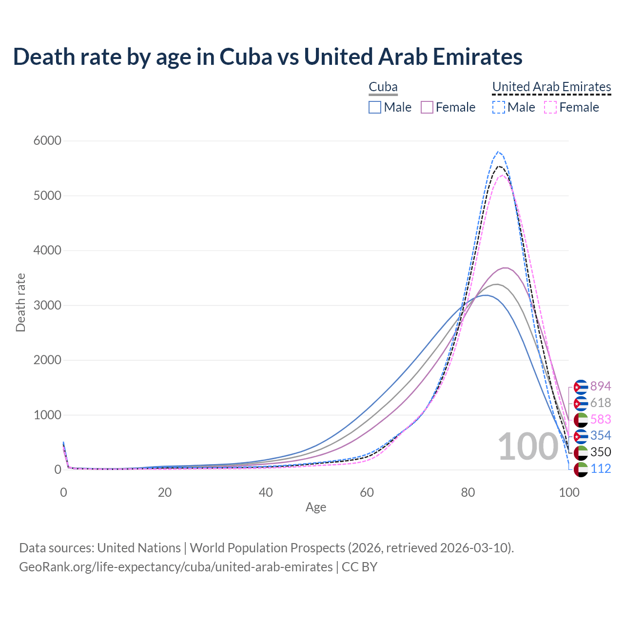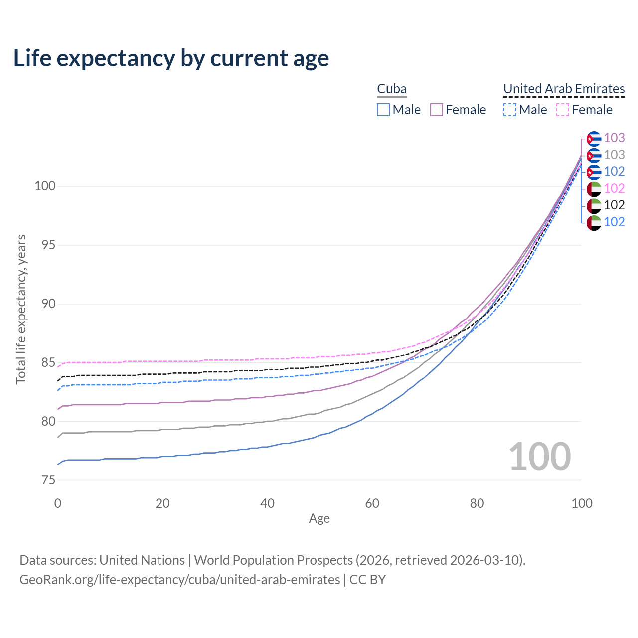 This life expectancy calculator shows the odds of living to 100, 95, 90, and below based on current age for both males and females in Cuba and the United Arab Emirates, along with mean and median age of death. The calculations are based on the 2026 life tables (actuarial tables) from the UN World Population Prospects.