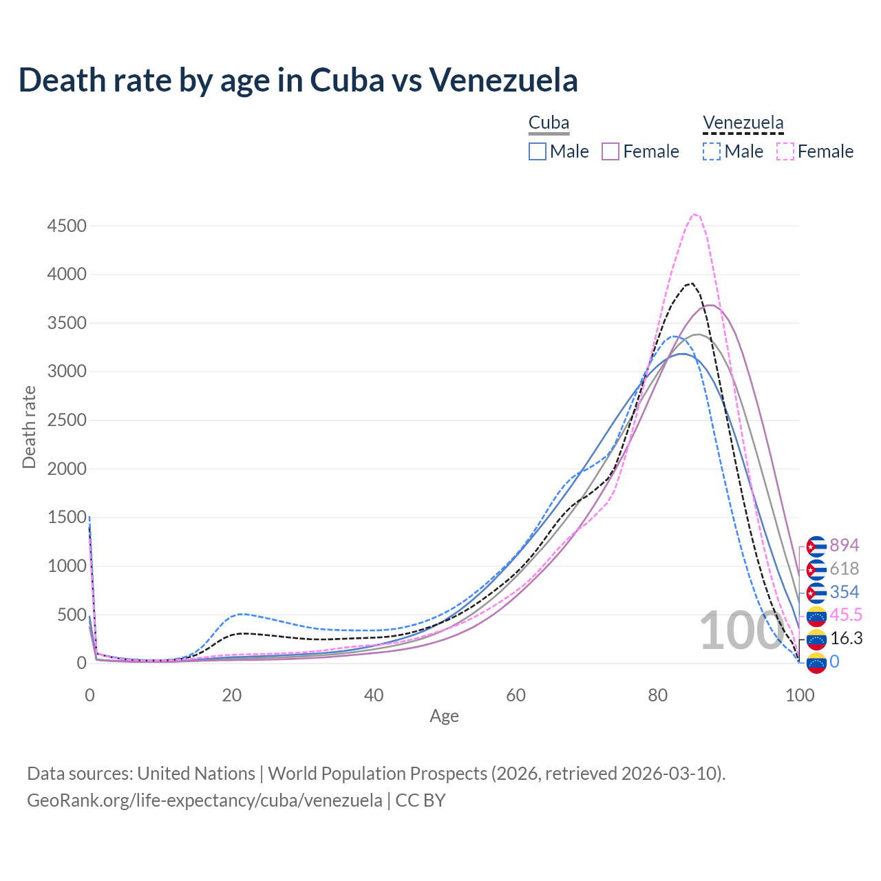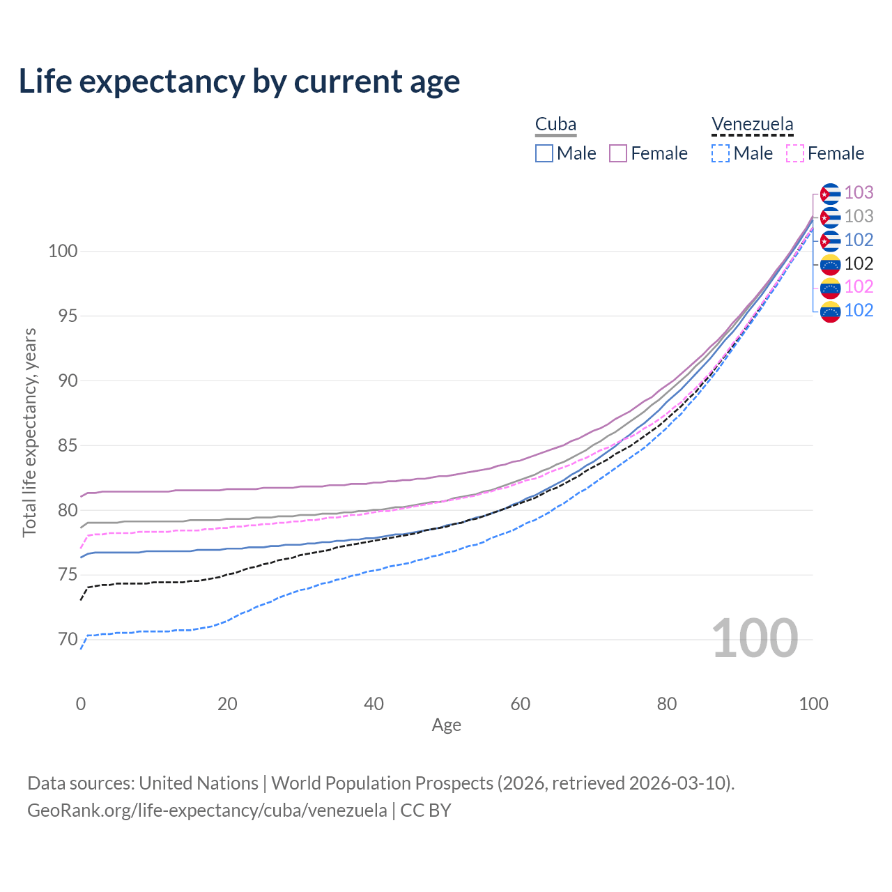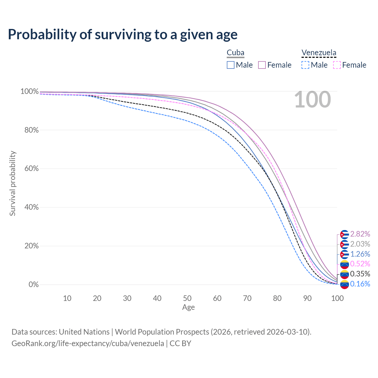 This life expectancy calculator shows the odds of living to 100, 95, 90, and below based on current age for both males and females in Cuba and Venezuela, along with mean and median age of death. The calculations are based on the 2026 life tables (actuarial tables) from the UN World Population Prospects.