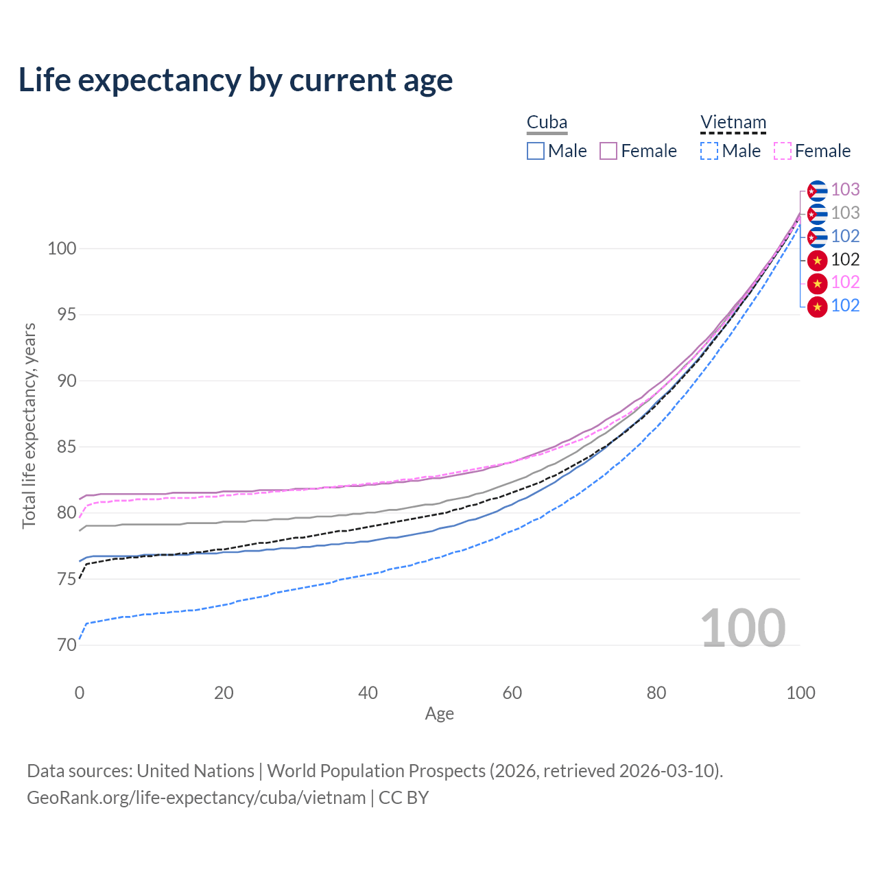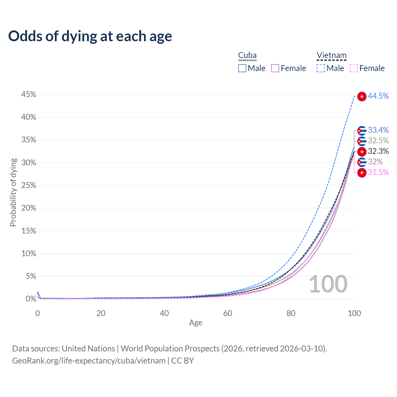 This life expectancy calculator shows the odds of living to 100, 95, 90, and below based on current age for both males and females in Cuba and Vietnam, along with mean and median age of death. The calculations are based on the 2026 life tables (actuarial tables) from the UN World Population Prospects.