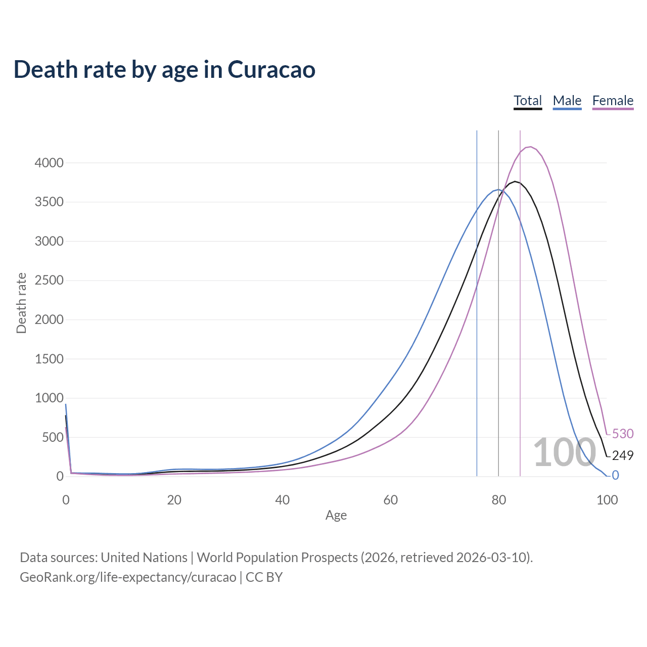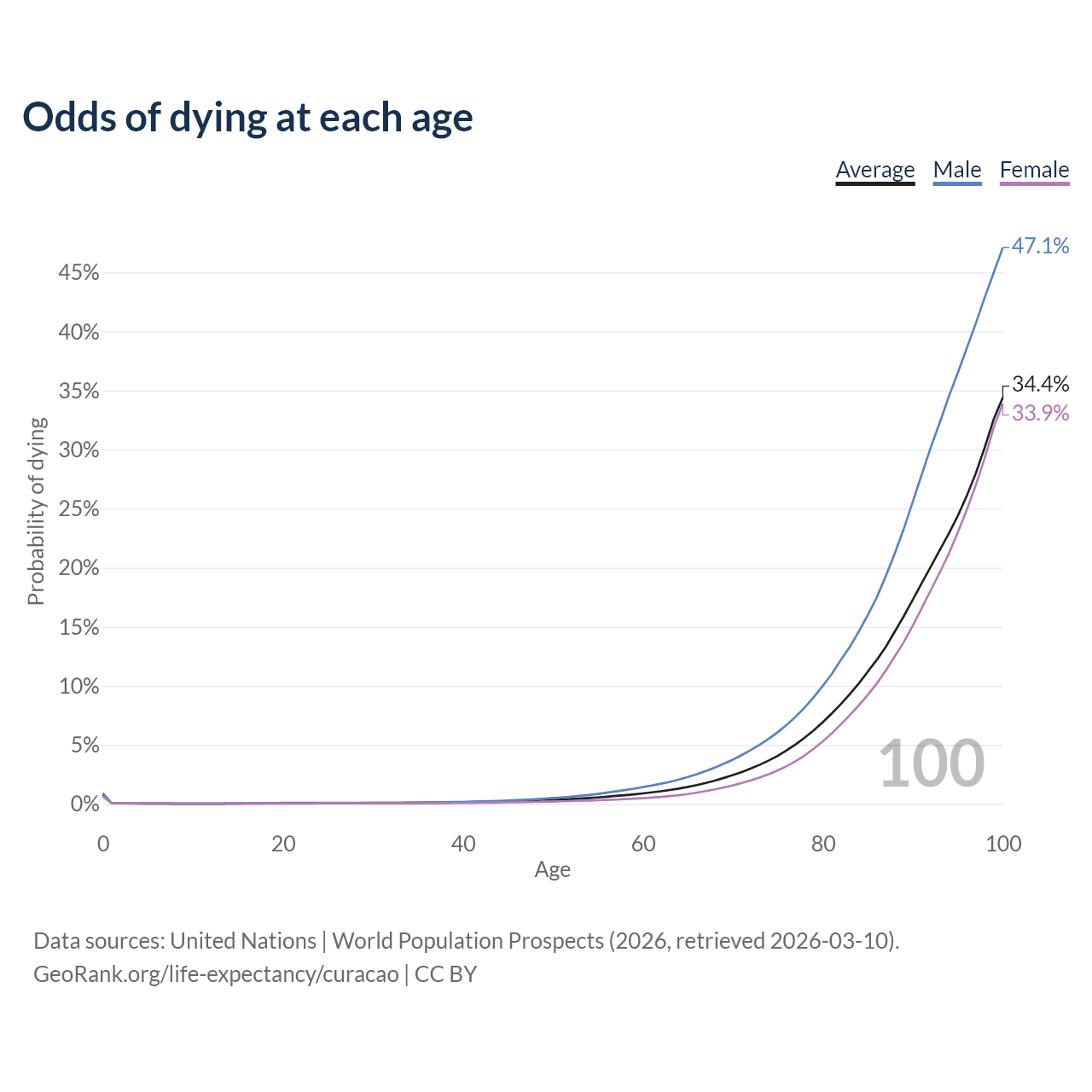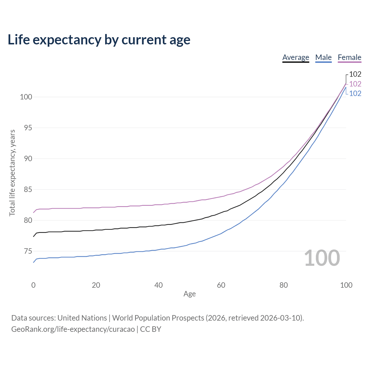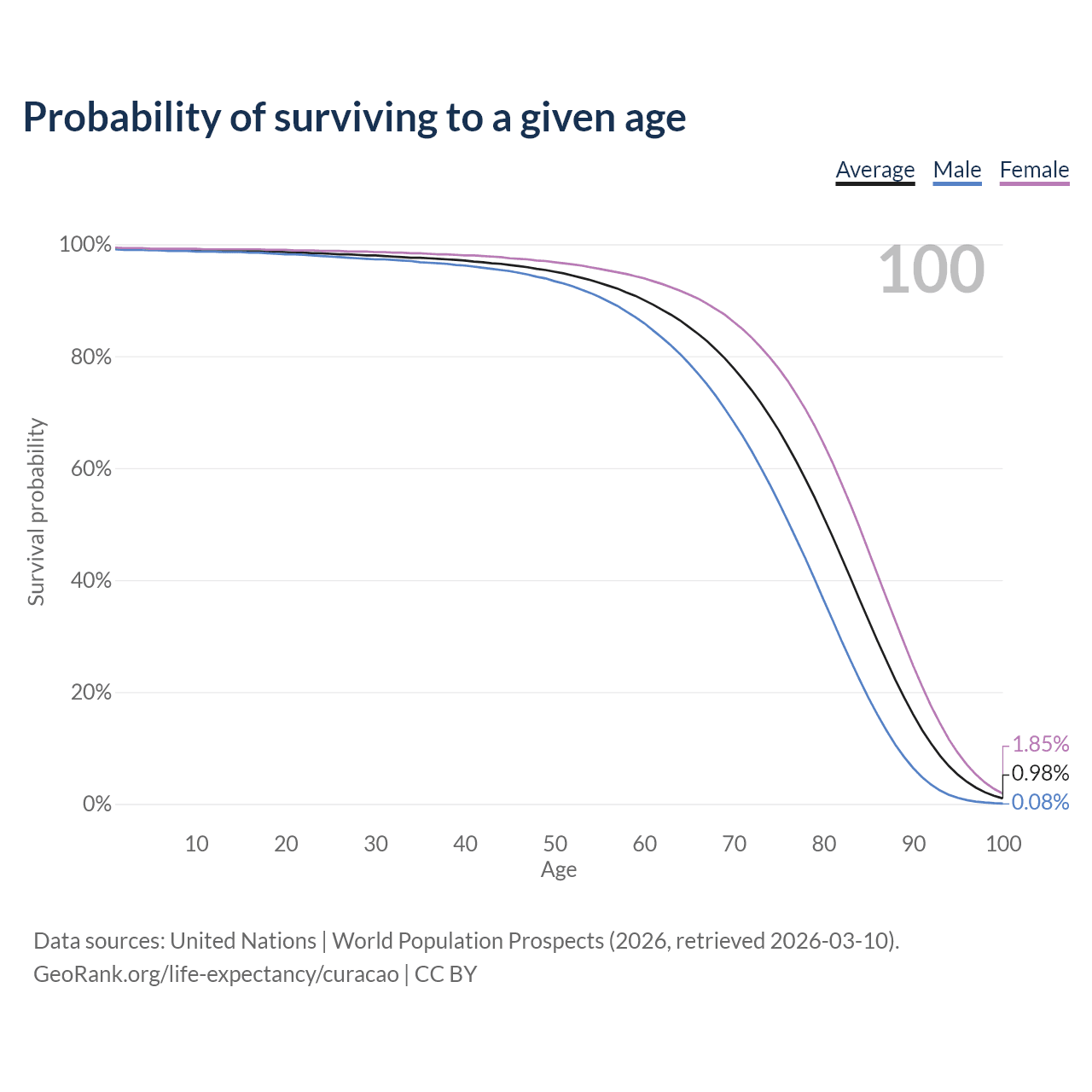 This life expectancy calculator shows the odds of living to 100, 95, 90, and below based on current age for both males and females in Curacao, along with mean and median age of death. The calculations are based on the 2026 life tables (actuarial tables) from the UN World Population Prospects.