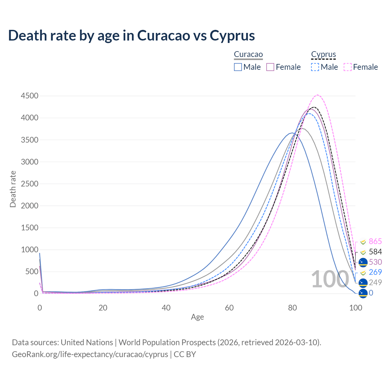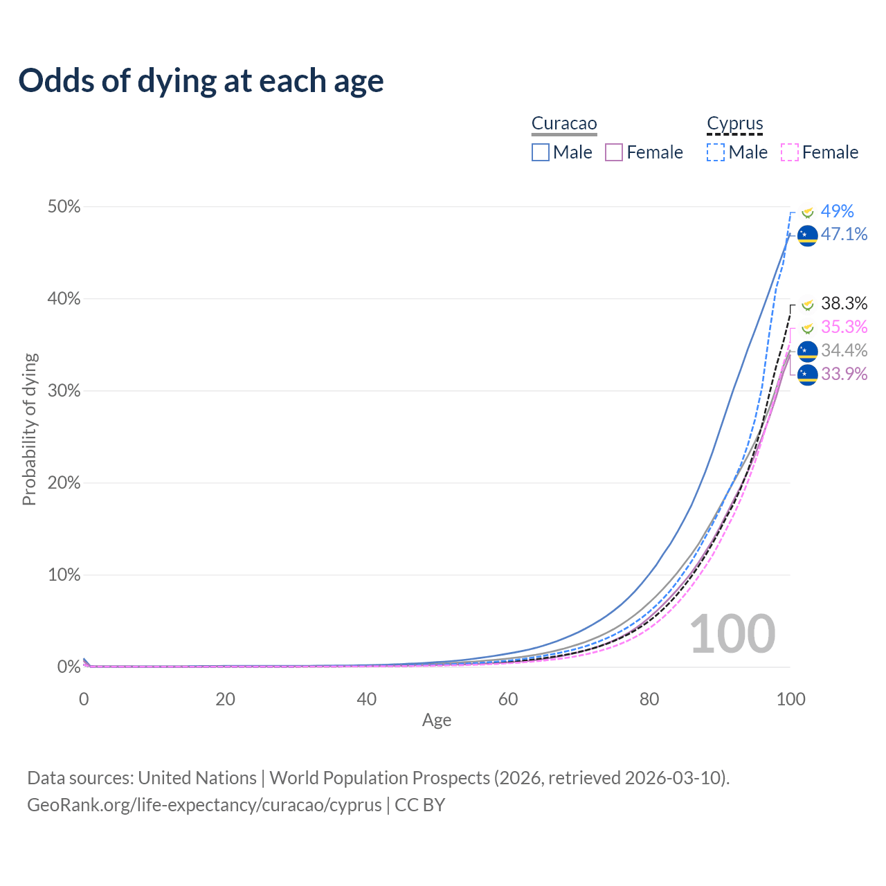 This life expectancy calculator shows the odds of living to 100, 95, 90, and below based on current age for both males and females in Curacao and Cyprus, along with mean and median age of death. The calculations are based on the 2026 life tables (actuarial tables) from the UN World Population Prospects.