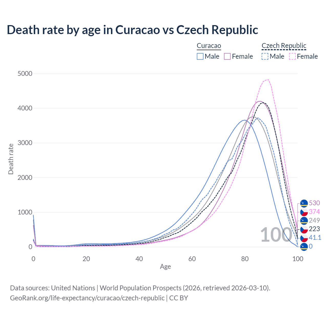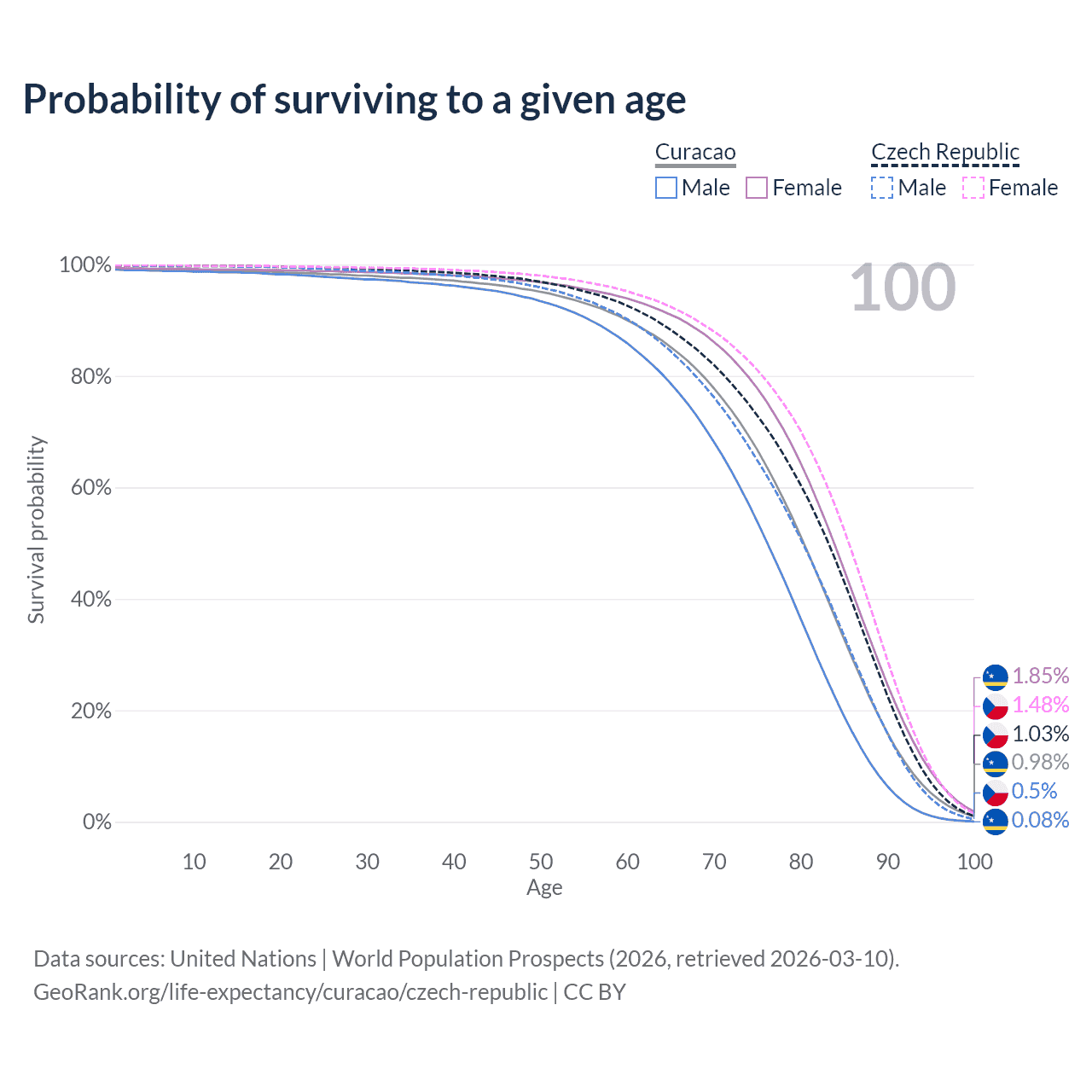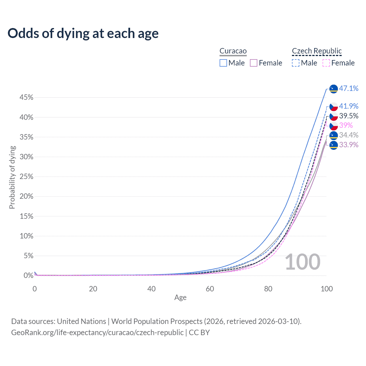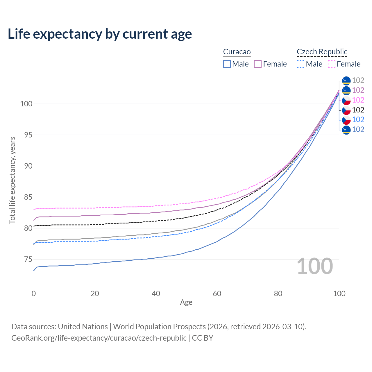 This life expectancy calculator shows the odds of living to 100, 95, 90, and below based on current age for both males and females in Curacao and the Czech Republic, along with mean and median age of death. The calculations are based on the 2026 life tables (actuarial tables) from the UN World Population Prospects.