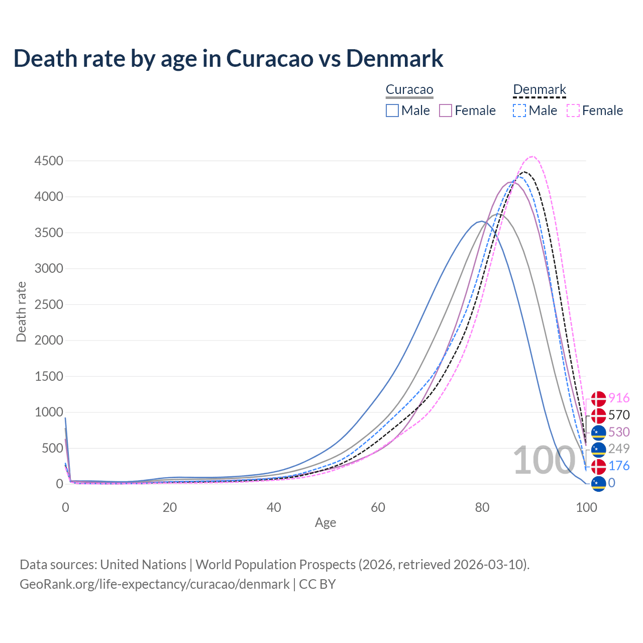 In Curacao, the most common age of death is 83, compared to 88 in Denmark. The median age of death is 80.4 in Curacao and 85.2 in Denmark, meaning only half of each cohort is expected to live past that age.