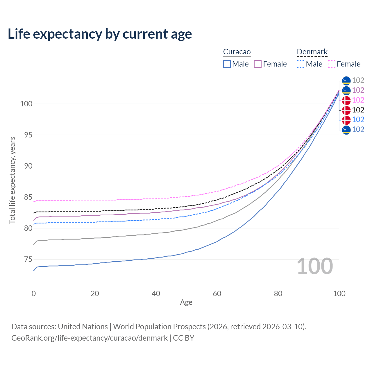 This life expectancy calculator shows the odds of living to 100, 95, 90, and below based on current age for both males and females in Curacao and Denmark, along with mean and median age of death. The calculations are based on the 2026 life tables (actuarial tables) from the UN World Population Prospects.