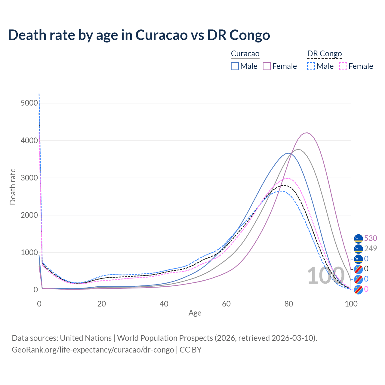 In Curacao, the most common age of death is 83, compared to 0 in the DR Congo. The median age of death is 80.4 in Curacao and 70.9 in the DR Congo, meaning only half of each cohort is expected to live past that age.