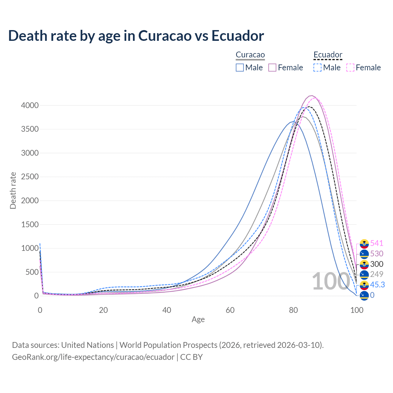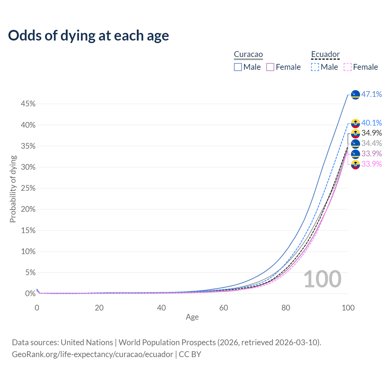 This life expectancy calculator shows the odds of living to 100, 95, 90, and below based on current age for both males and females in Curacao and Ecuador, along with mean and median age of death. The calculations are based on the 2026 life tables (actuarial tables) from the UN World Population Prospects.
