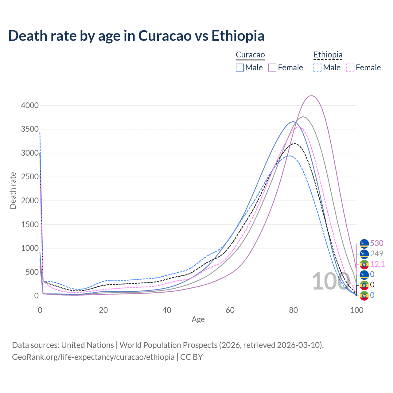 In Curacao, the most common age of death is 83, compared to 80 in Ethiopia. The median age of death is 80.4 in Curacao and 74.8 in Ethiopia, meaning only half of each cohort is expected to live past that age.