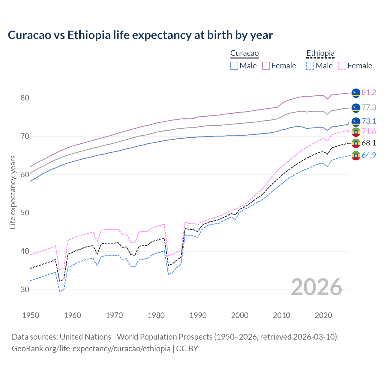The average life expectancy at birth is 77.3 years in Curacao vs 68.1 in Ethiopia. Curacao is ranked 71/197 by life expectancy, and Ethiopia is 150/197. In Curacao, the life expectancy is 73.1 years for males and 81.2 years for females. In Ethiopia, it's 64.9 years for males and 71.6 years for females.