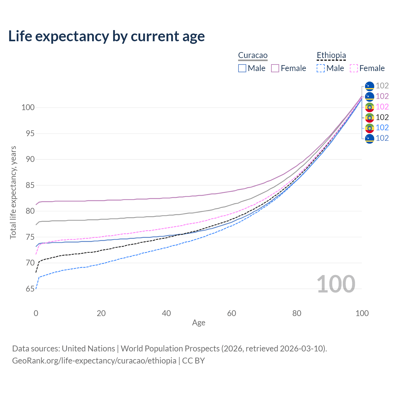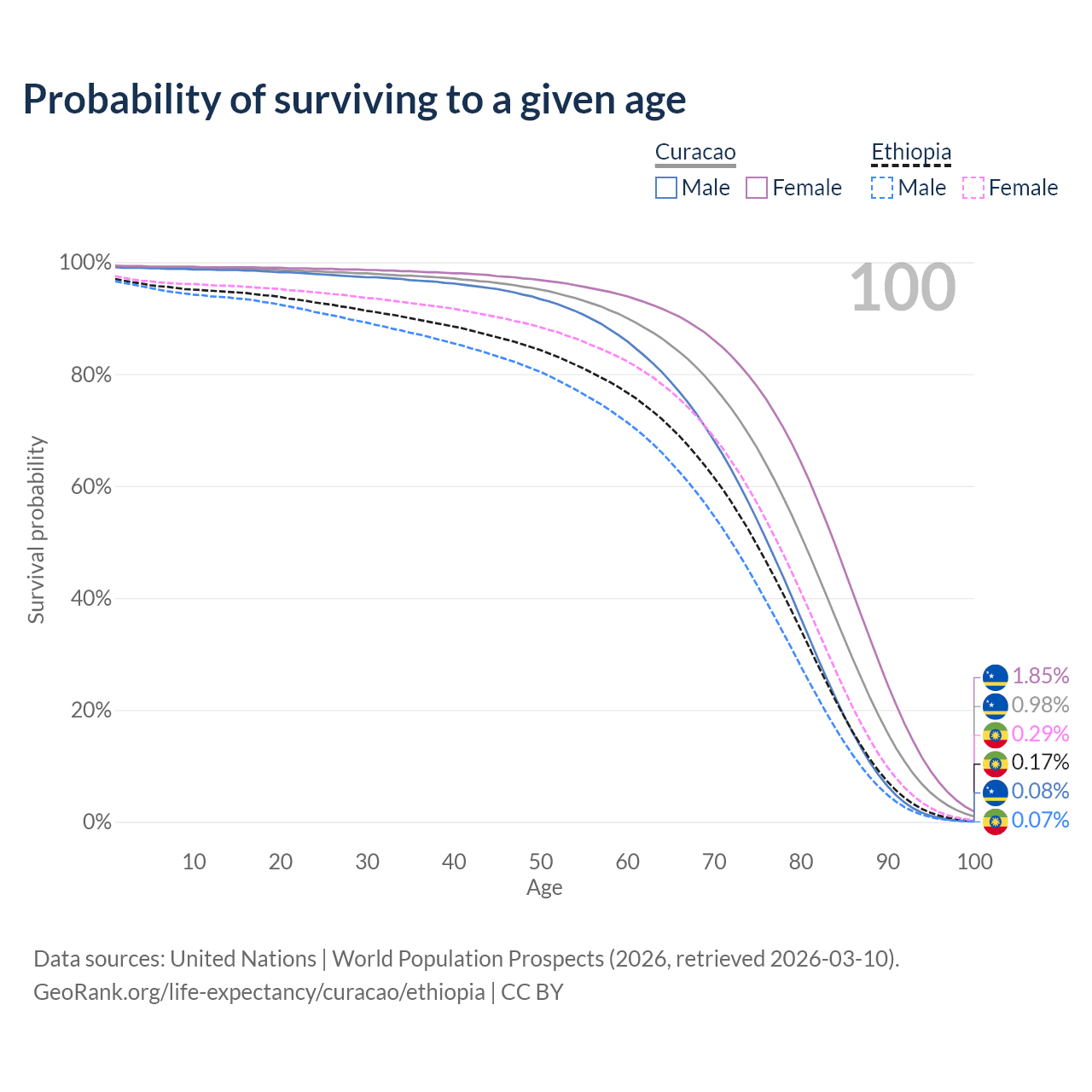 This life expectancy calculator shows the odds of living to 100, 95, 90, and below based on current age for both males and females in Curacao and Ethiopia, along with mean and median age of death. The calculations are based on the 2026 life tables (actuarial tables) from the UN World Population Prospects.